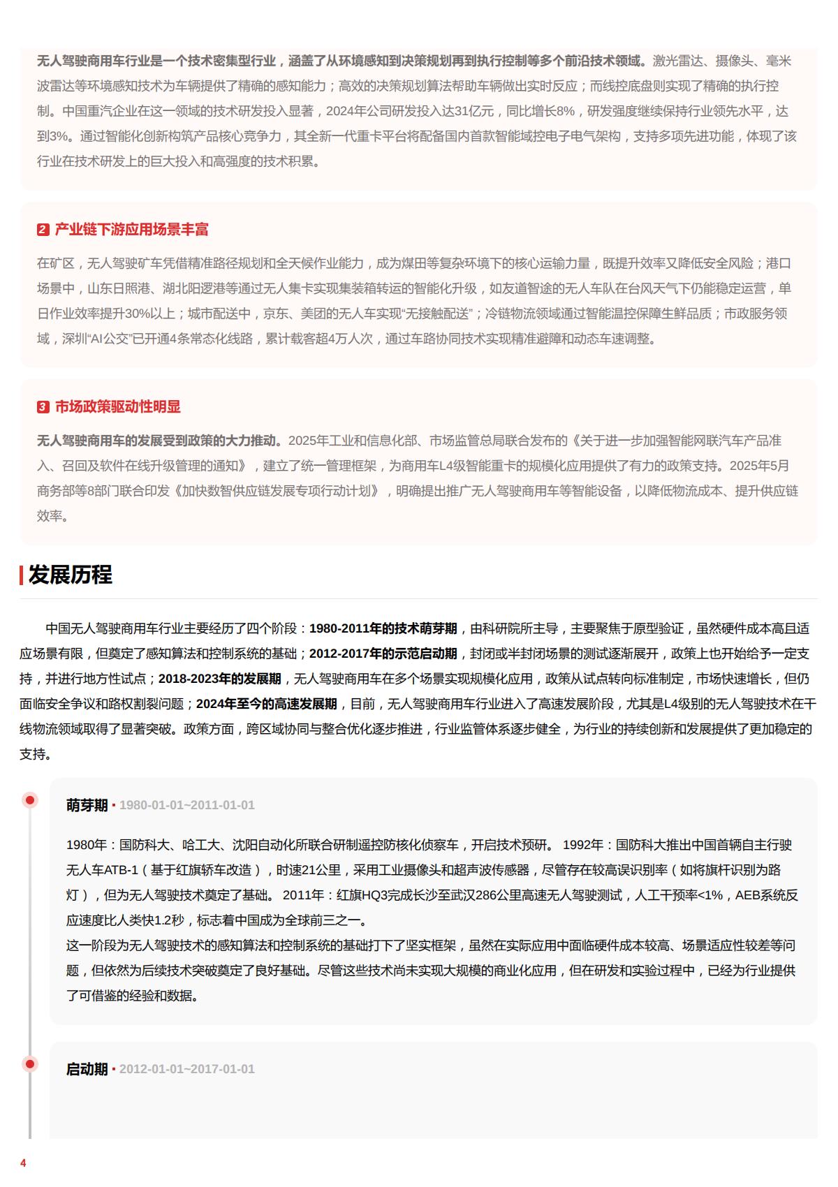 中国无人驾驶商用车行业主要经历了四个阶段:1980-2011年的技术萌芽期,由科研院所主导,主要聚焦于原型验证,虽然硬件成本高且适应场景有限,但奠定了感知算法和控制系统的基础;2012-2017年的示范启动期,封闭或半封闭场景的测试逐渐展开,政策上也开始给予一定支持,并进行地方性试点;2018-2023年的发展期,无人驾驶商用车在多个场景实现规模化应用,政策从试点转向标准制定,市场快速增长,但仍面临安全争议和路权割裂问题;2024年至今的高速发展期,目前,无人驾驶商用车行业进入了高速发展阶段,尤其是L4级别的无人驾驶技术在干线物流领域取得了显著突破。政策方面,跨区域协同与整合优化逐步推进,行业监管体系逐步健全,为行业的持续创新和发展提供了更加稳定的支持.