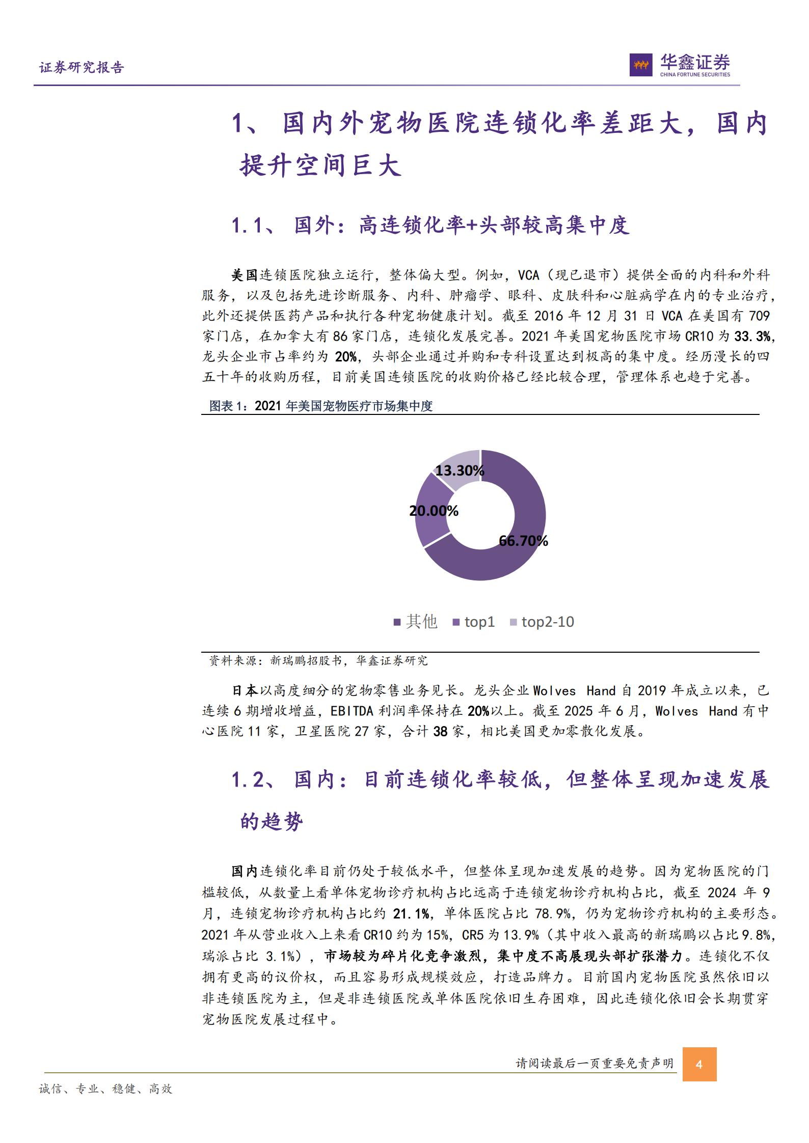美国连锁医院独立运行,整体偏大型。例如,VCA(现已退市)提供全面的内科和外科服务,以及包括先进诊断服务、内科、肿瘤学、眼科、皮肤科和心脏病学在内的专业治疗,此外还提供医药产品和执行各种宠物健康计划。截至2016年12月31日VCA在美国有709家门店,在加拿大有86家门店,连锁化发展完善。2021年美国宠物医院市场CR10为33.3%,龙头企业市占率约为20%,头部企业通过并购和专科设置达到极高的集中度。经历漫长的四五十年的收购历程,目前美国连锁医院的收购价格已经比较合理,管理体系也趋于完善。日本以高度细分的宠物零售业务见长。龙头企业Wolves Hand自2019年成立以来,已连续6期增收增益,EBITDA利润率保持在20%以上。截至2025年6月,Wolves Hand有中心医院11家,卫星医院27家,合计38家,相比美国更加零散化发展。