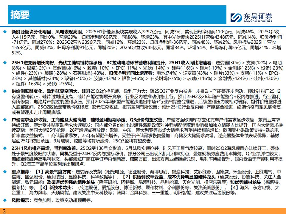 25H1风电排产高增,毛利率改善。25Q2受136号文影响,5月陆风实现抢装,陆风开工景气度较高,同时25Q2海风项目亦陆续开工,整体处于景气度较旺的状态。风机受益于24H2反内卷投标涨价,部分公司已出现风机毛利率拐点,叠加规模效应费用率摊薄,Q2业绩弹性较大;海缆继续维持高毛利状态,头部海缆厂商在手订单再创新高。塔筒方面,出海方向业绩继续兑现,毛利率持续提升,国内受益于产能利用率提升,Q2海工产品单位盈利亦出现拐点。