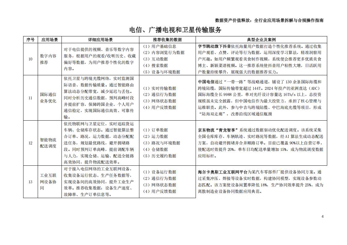 典型企业及案例字节跳动旗下抖音依托海量用户数据打造个性化推荐系统。通过收集用户观看、点赞、评论等行为数据,运用深度学习算法,精准洞察用户兴趣。如用户频繁观看美食制作视频,系统便会推荐更多优质美食博主、新颖菜谱视频。这一推荐系统使抖音用户粘性大增,日活跃用户数量持续攀升,展现强大的数据推荐实力。中国电信通过“一带一路”等战略通道,铺设了130余条国际海缆和跨境陆缆,国际传输带宽超过144T.224年投产的亚洲直达(ADC)国际海缆全长988公里,单对光纤设计容量达16Tb/s以上,总投资规模虽未完全披露,但中国电信作为最大投资方,承担了核心管理与运维职责。此外,参与中吉鸟跨境陆缆、中巴海底光缆等项目,形成“陆海双走廊”,改善沿线区域通信瓶颈京东物流“青龙智享”系统通过数据驱动优化配送调度。该系统采集全国仓库库存、车辆轨迹、实时路况等数据,经AI算法生成动态配送方案,自动避开拥堵并合并顺路订单。目前已覆盖90%以上自营订单,使配送时效提升205,单车日均配送单量增加15%,成为物流调度数据应用标杆。海尔卡奥斯工业互联网平台为某汽车零部件厂提供设备协同方案。通过采集冲压、焊接等设备实时数据,构建协同模型,实现设备参数动态匹配。该方案使设备闲置率降低18%,生产协同效率提升25%,成为