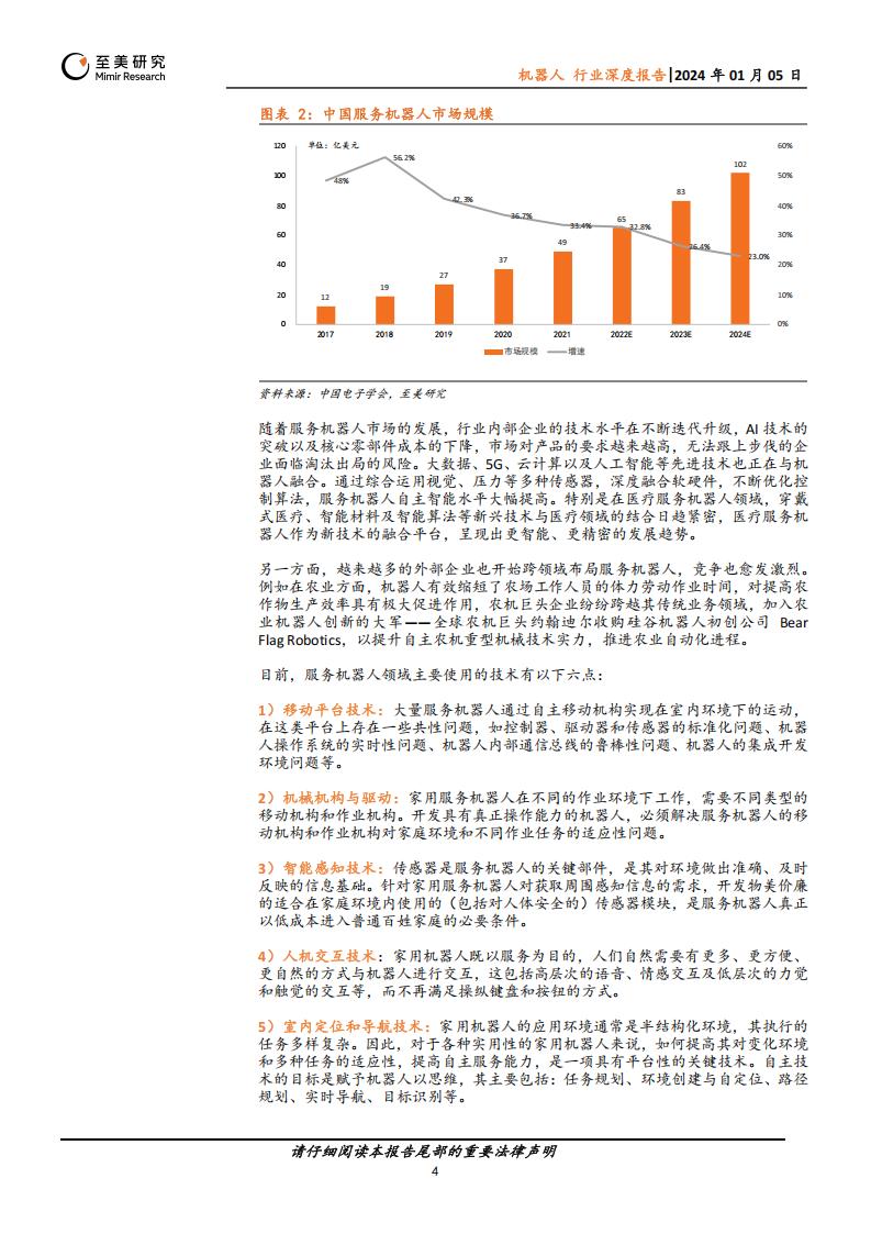中国作为全球最大的机器人市场,增速始终处于领先水平。据中国电子学会数据显示,2017-2022年,我国服务机器人市场规模由12亿美元增长至65亿美元,年均增速高达30%,公共服务、教育等领域需求已成为推动服务机器人发展的主要动力。到2024年,随着新兴场景的进一步拓展,中国服务机器人市场规模将有望突破102亿美元。