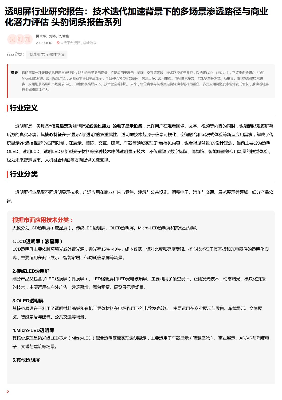 摘要 透明屏是一种兼具信息星示与光透过能力的电子量示设备,广泛应用于屡示、美账、交互等领域。技术路径多元井存,以透明LCD、LED为主,正逐步向透明OLED和MicrnLED演进,应用场景广泛,从商业零售到车载显示,再到ARNR与智禁空间,构建出多元应用生态,市场由索东方、TCL华星等少数厂商主导,市场规模受技术进步、应用场景拓腰和市场需求性动,但也面临高雕成本、技术壁垒辱制约,未来,堵位免争与技术实破路驱动市场格局重塑,多元应用将激发市场螺发式增长,推动遇明屏行业规模持续扩大。