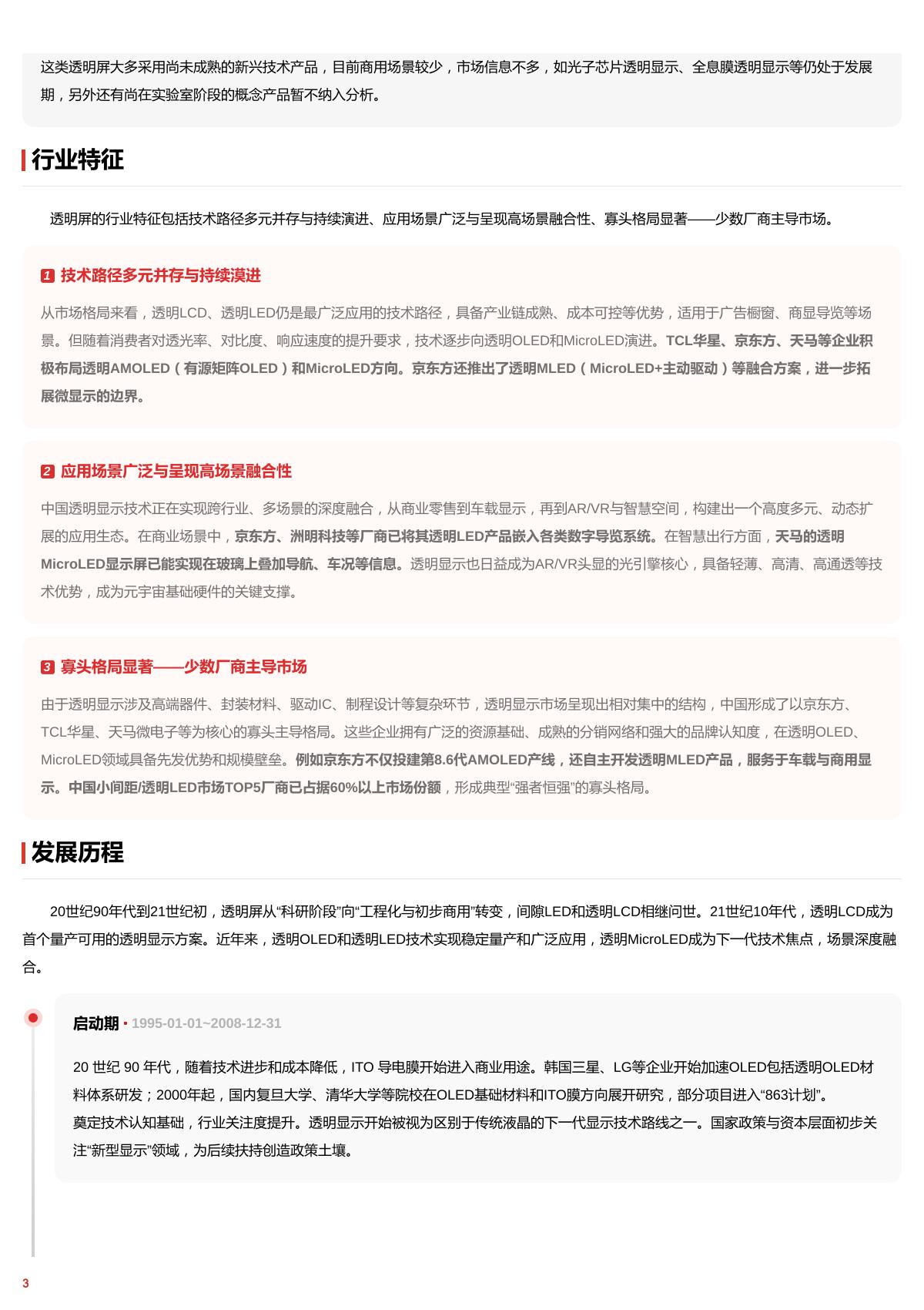 20世纪90年代到21世纪初,透明屏从科研阶段“向“工程化与初步商用转变,间隙LED和透明LCD相继问世,21世纪10年代,透明LCD成为首个量产可用的透明显示方案,近年来,透明OLED和透明LED技术实现稳定量产和广泛应用,透明MicroLED成为下一代技术焦点,场景深度融合。