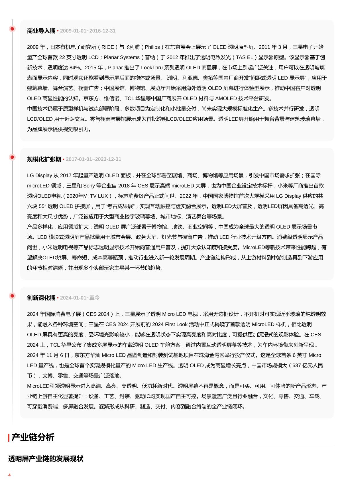 2024年国际消费电子展(CES 2024)上,三星展示了透明Micro LED电视,采用无边框设计,不开机时可实现近乎玻璃的纯透明效果,能融入各种环墙空间;三星在CES 2024开展前的2024 First Look活动中正式揭晓了首款透明MicroLED样机,相比透明OLED屏具有更高的亮度,受环境光影响较小,能够在透明状态下实现高亮度和高对比度,可提供更加沉漫式的观影体验。在CES2024上,TCL华星公布了集成多屏显示的车载透明OLED车舱方案,通过内置互动透明屏幕等技术,为车内环境带来创新呈现,2024年11月6日,京东方华灿Micro LED品圆制造和封装测试基地项目在珠海金湾区举行投产仪式,这是全球首条6英寸MicroLED量产线,也是全球首个实现规模化量产的Micro LED生产线。透明OLED成为商显增长亮点,中国市场规模大(637亿元人民币),文博、零售、交通等场景广泛落地。