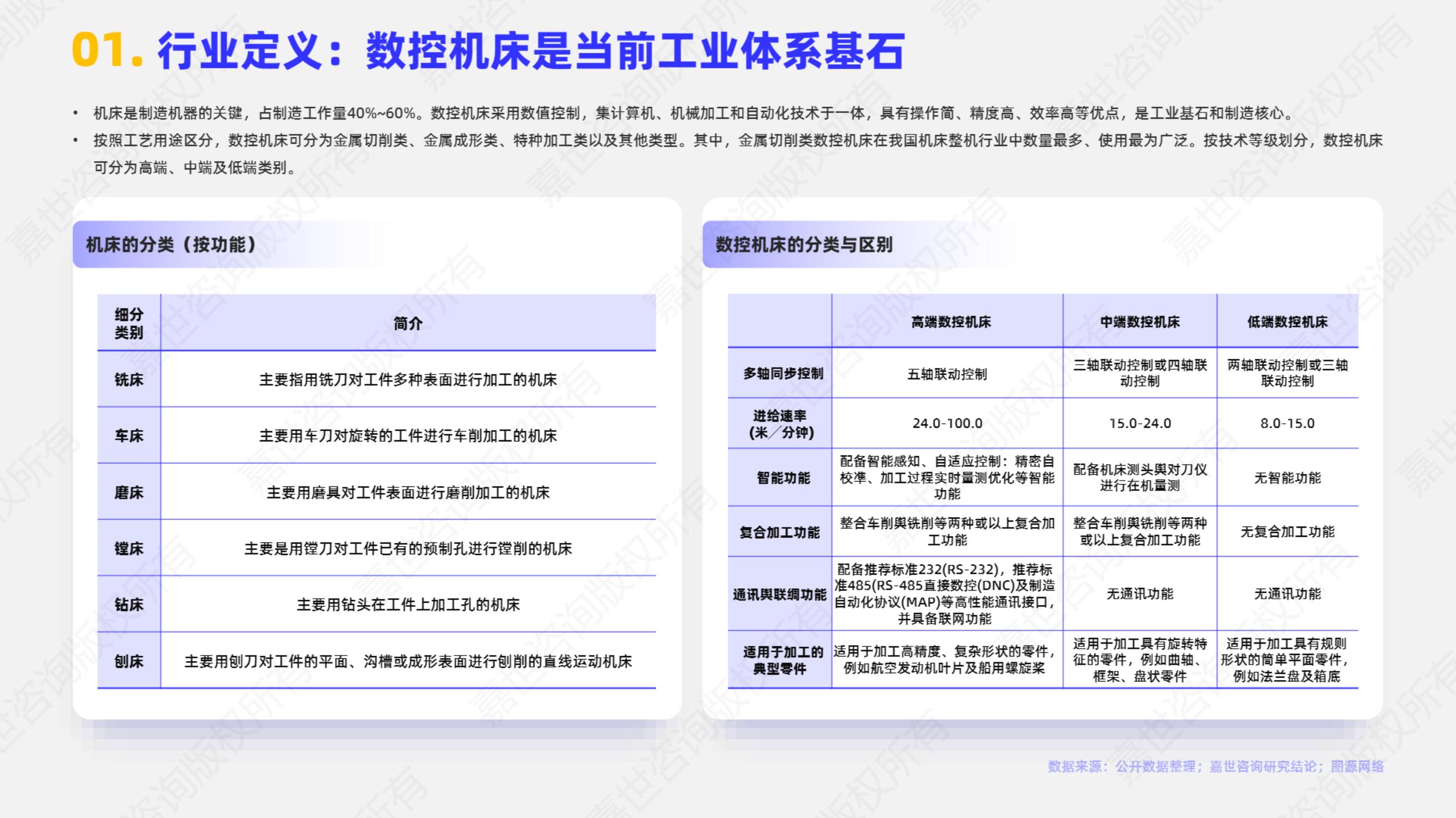 机床足制造机器的关键,占制造工作量40%-60%。数控机床采用数佰控制,集计算机、机极加工和自动化技术于一体,具有操作筒、精度高、效率高等优点,是工业基石和制造核心。按照工艺用途区分,数控机床可分为金属切削炎、金属成形类、特种加工类以及其他类型。其中,金属切削炎数控机床在我国机床整机行业中数量最多、使用最为广泛。按技术等级划分,数控机床可分为高端、中端及低端类别。