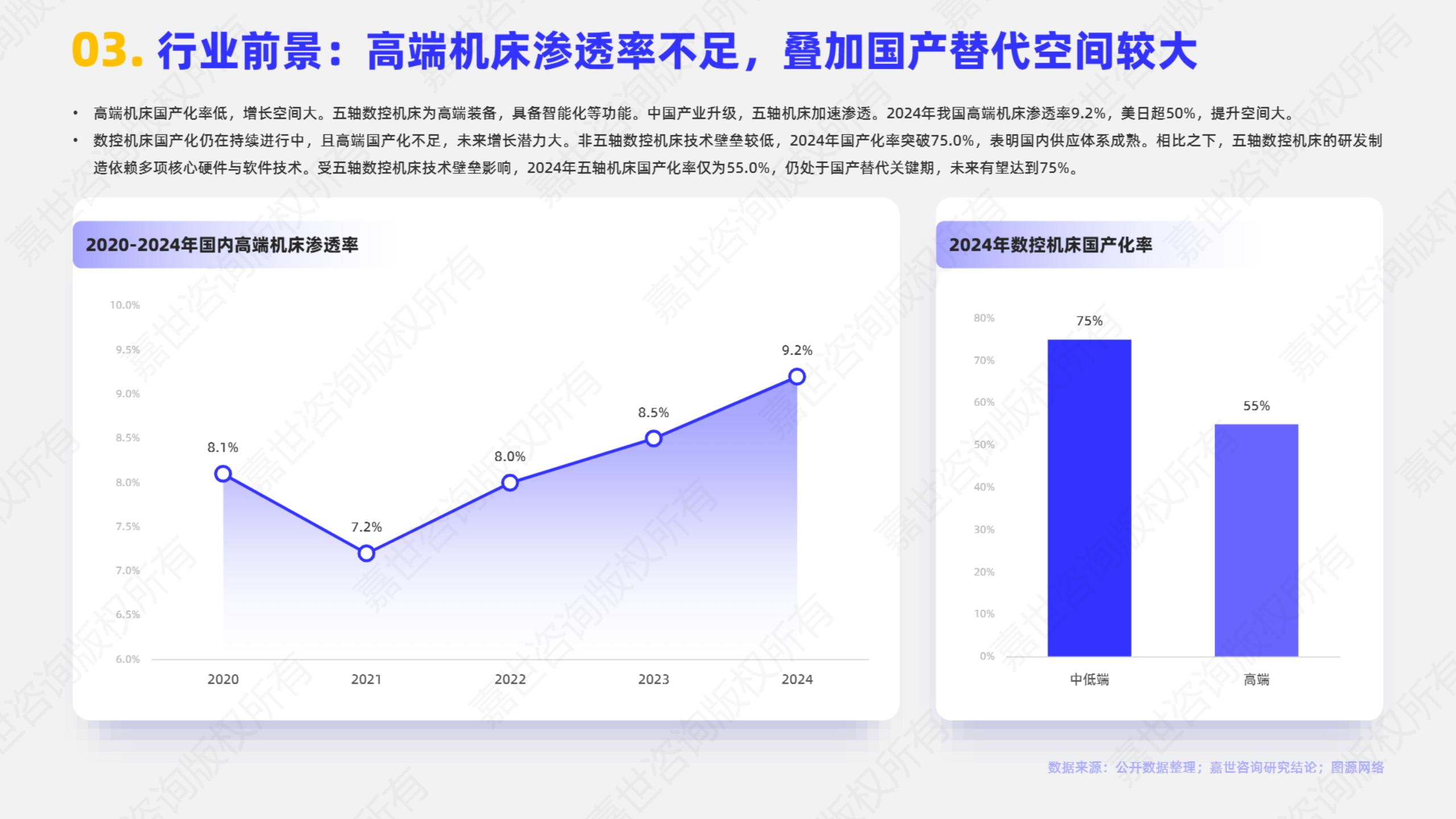 高端机床国产化率低,增长空间大。五轴数控机床为高端鞍备,具备智能化等功能。中国产业升级,五轴机床加速渗透。2024年我国高端机床渗透率9.2%,美日超50%,提升空间大。数控机床国产化仍在持续进行中,且高端国产化不足,未来增长潜力大。非五轴数控机床技术壁垒较低,2024年国产化率突破75.0%,表明国内供应体系成熟。相比之下,五轴数控机床的研发制造依赖多项核心硬件与软件技术。受五轴数控机床技术壁垫影响,2024年五轴机床国产化率仅为55.0%,仍处于国产替代关键期,未来有望达到75%。