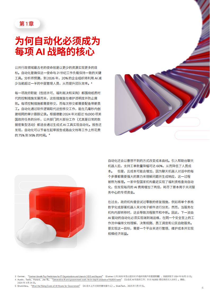 公共行政领域最古老的使命就是以更少的资源实现更多的目标。自动化是确保这一使命与21世纪工作负载保持一致的关键工具。分析师预测,到2026年,20%的企业组织将利用AI减少当前超过一半的中层管理人员,从而提升团队效率。3