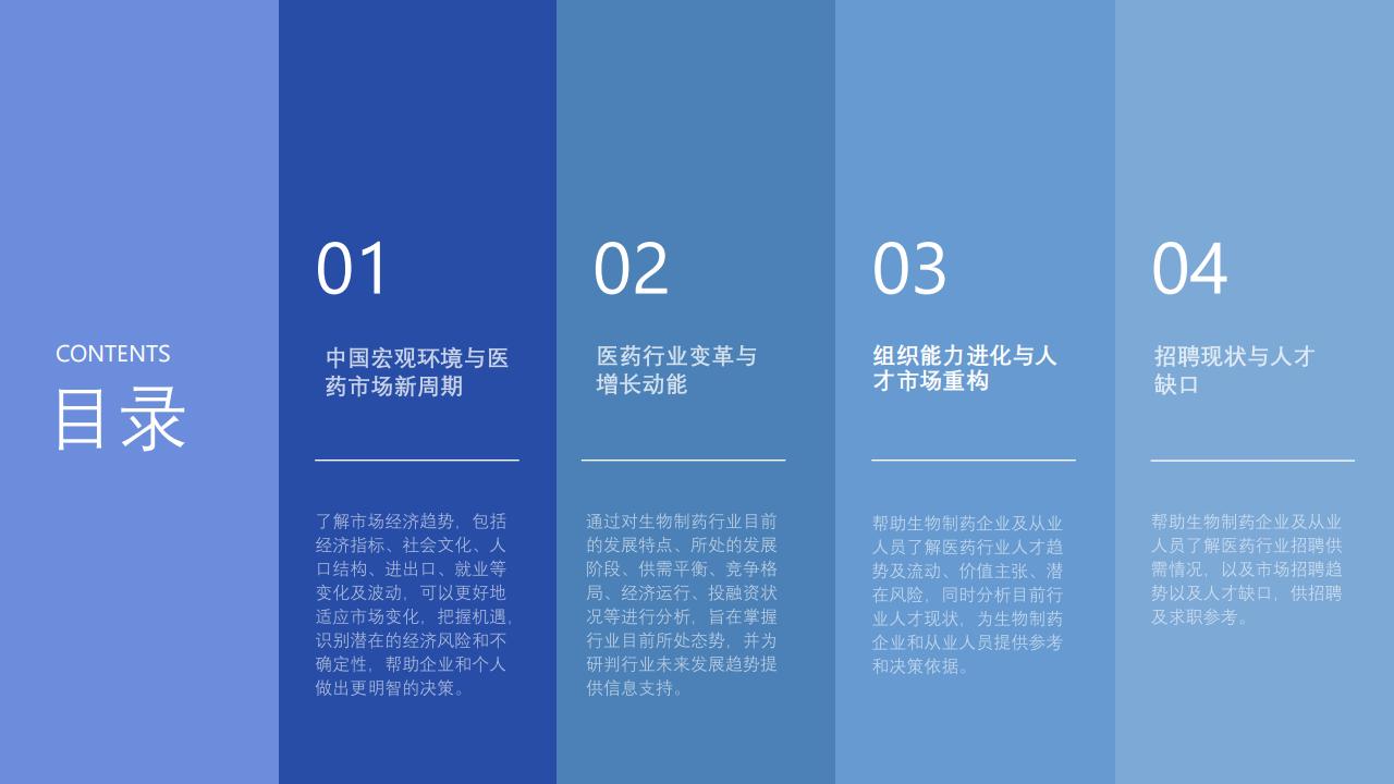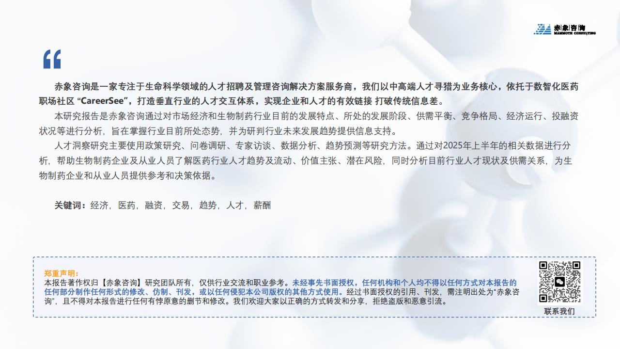 人才洞察研究主要使用政策研究、问卷调研、专家访谈、数据分析、趋势预测等研究方法。通过对2025年上半年的相关数据进行分析,帮助生物制药企业及从业人员了解医药行业人才趋势及流动、价值主张、潜在风险,同时分析目前行业人才现状及供需关系,为生物制药企业和从业人员提供参考和决策依据。