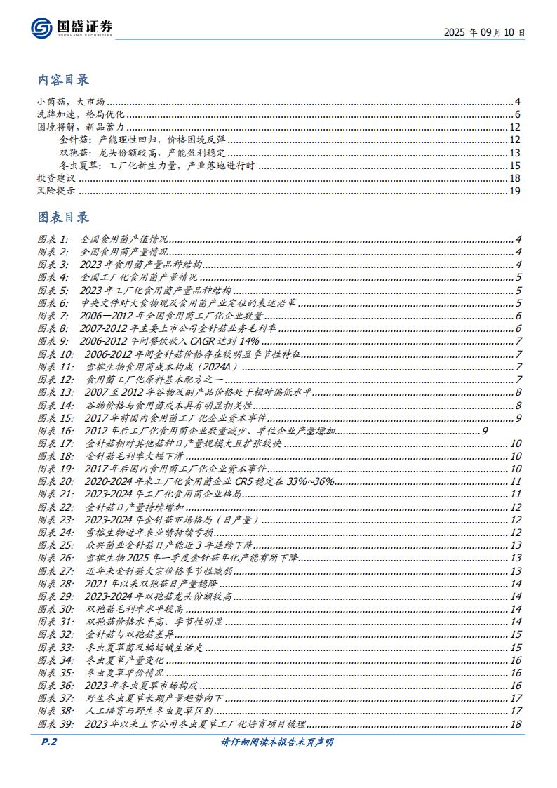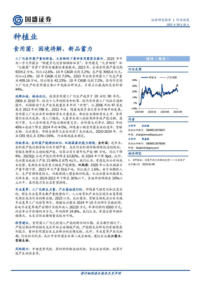 投资建议。食用菌工厂化已经进入产能的理性回归期,在长期亏损之下,产能过剩品种的相关龙头开始主动调减产能;产能稳定品种或仍有继续盈利能力,看好食用菌企业主业部分的业绩反转。此外,冬虫夏草产业化初期,行业红利仍在,或打开食用菌企业第二成长曲线,建议关注众兴菌业、雪榕生物。