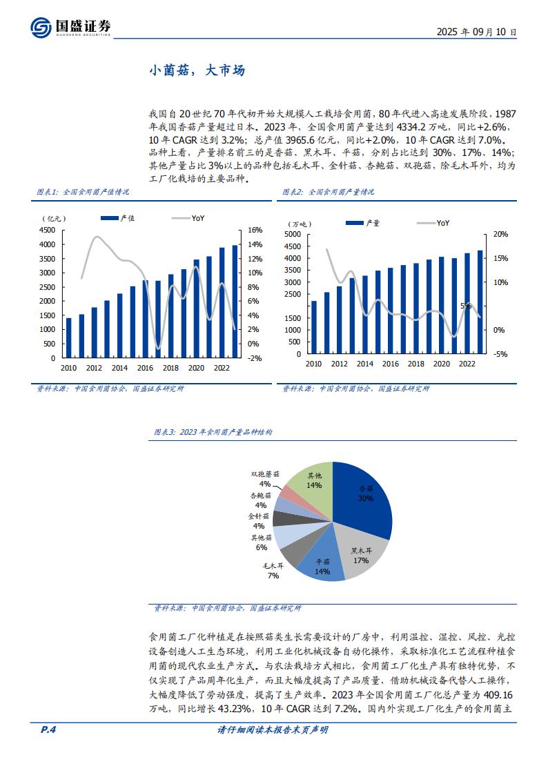 我国自20世纪70年代初开始大规模人工栽培食用菌,80年代进入高速发展阶段,1987年我国香菇产量超过日本。2023年,全国食用菌产量达到4334.2万吨,同比+2.6%,10年CAGR达到3.2%;总产值3965.6亿元,同比+2.0%,10年CAGR达到7.0%。品种上看,产量排名前三的是香菇、黑木耳、平菇,分别占比达到30%、17%、14%;其他产量占比3%以上的品种包括毛木耳、金针菇、杏鲍菇、双孢菇,除毛木耳外,均为工厂化栽培的主要品种。