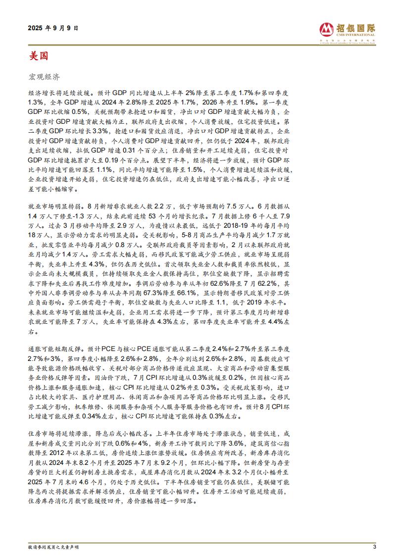 就业市场明显转弱。8月新增非农就业人数2.2万,低于市场预期的7.5万人。6月数据从1.4万人下修至-1.3万人,结束此前连续53个月的增长纪录。7月数据上修6千人至7.9万人。过去3月移动平均降至2.9万人,为疫情以来最低,远低于2018-19年的每月平均18万人,显示劳动力需求的明显走弱。受关税影响,5-8月商品生产平均每月减少1.7万就业,批发零售业平均每月减少0.8万人。受联邦政府裁员等因素影响,2月以来联邦政府就业月均减少1.4万人。劳工需求大幅走弱,而移民政策可能减少劳工供应,就业市场呈现弱平衡,失业率上升至4.3%,但仍在历史低位。首次领取失业金人数和裁员率依然较低,显示企业尚未大规模裁员,但持续领取失业金人数保持高位,职位空缺数下降,显示招聘需求下降和失业后再找工作难度增加。季调后劳动参与率从年初62.6%降至7月62.2%,其中外国人非季调劳动参与率从去年同期67.3%降至66.1%,显示特朗普移民政策对劳工供应负面影响。劳工供需趋于平衡,职位空缺数与失业人口比降至1.1,低于2019年水平。未来就业市场可能继续温和走弱,企业用工需求将进一步下降,预计第三季度月均新增非农就业可能降至7万人,失业率可能保持在4.3%左右,第四季度失业率可能升至4.4%左右。