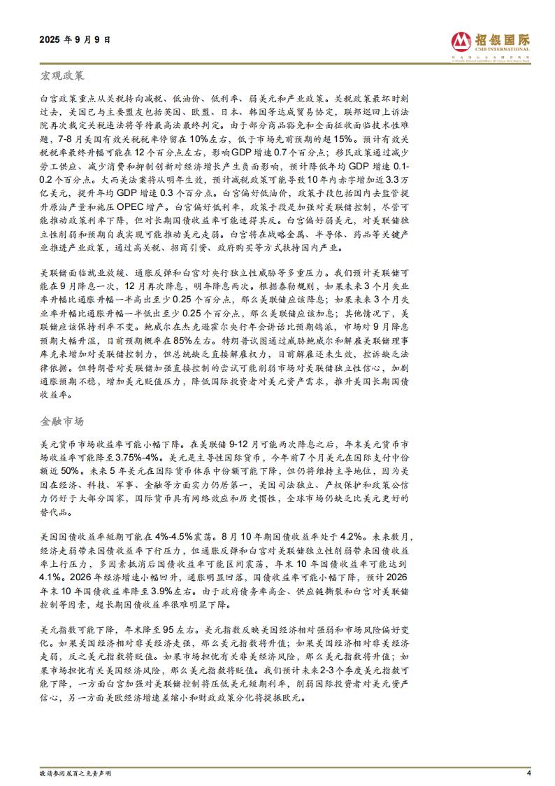 白宫政策重点从关税转向减税、低油价、低利率、弱美元和产业政策。关税政策最坏时刻过去,美国已与主要盟友包括英国、欧盟、日本、韩国等达成贸易协定,联邦巡回上诉法院再次裁定关税违法将等待最高法最终判定。由于部分商品豁免和全面征收面临技术性难题,7-8月美国有效关税税率停留在10%左右,低于市场先前预期的超15%。预计有效关税税率最终升幅可能在12个百分点左右,影响GDP增速0.7个百分点;移民政策通过减少劳工供应、减少消费和抑制创新对经济增长产生负面影响,预计降低年均GDP增速0.1-0.2个百分点。大而美法案将从明年生效,预计减税政策可能导致10年内赤字增加近3.3万亿美元,提升年均GDP增速0.3个百分点。白宫偏好低油价,政策手段包括国内去监管提升原油产量和施压OPEC增产。白宫偏好低利率,政策手段是加强对美联储控制,尽管可能推动政策利率下降,但对长期国债收益率可能适得其反。白宫偏好弱美元,对美联储独立性削弱和预期自我实现可能推动美元走弱。白宫将在战略金属、半导体、药品等关键产业推进产业政策,通过高关税、招商引资、政府购买等方式扶持国内产业。