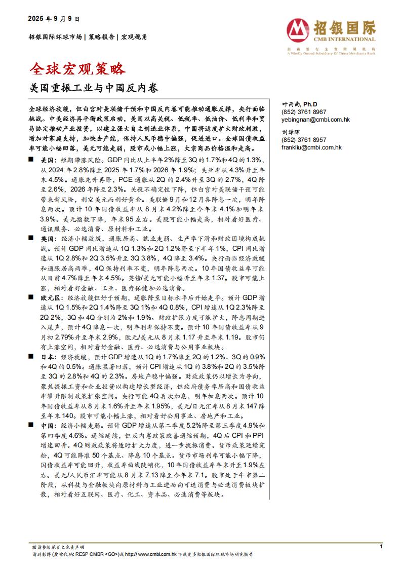 全球经济放缓,但白宫对美联储干预和中国反内卷可能推动通胀反弹,央行面临挑战。中美经济再平衡政策启动,美国以高关税、低税率、低油价、低利率和贸易协定推动产业投资,以建立强大自主制造业体系,中国将适度扩大财政刺激,增加对家庭支持,加快去产能,保持人民币稳中偏强,促进进口。全球国债收益率可能小幅回落,美元可能走弱,股市或小幅上涨,大宗商品价格温和走高。