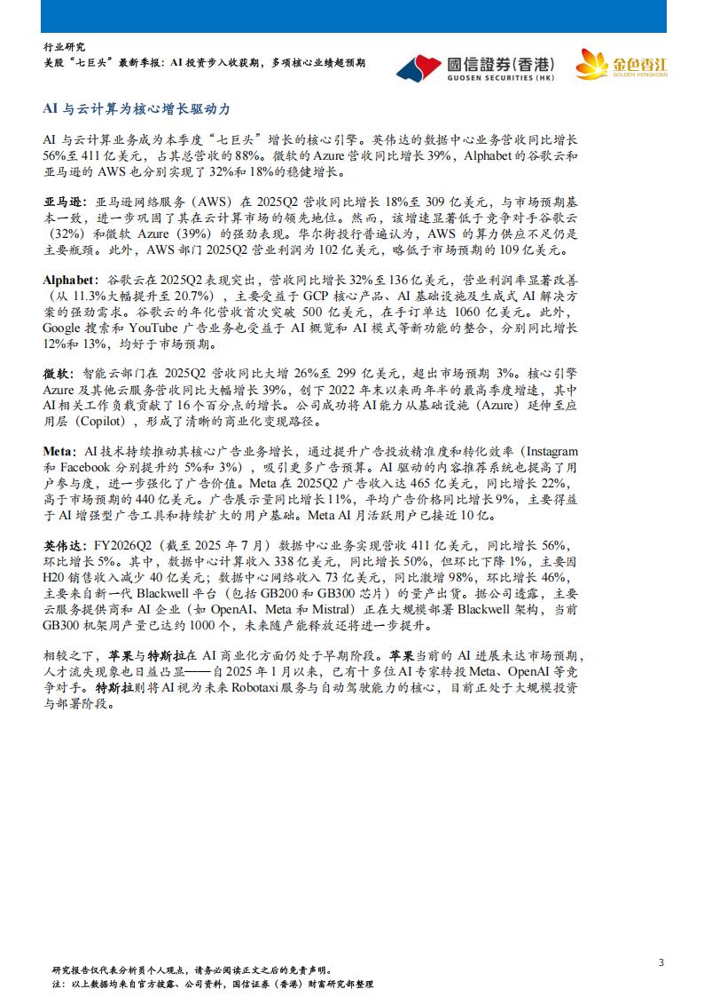 AI与云计算业务成为本季度“七巨头”增长的核心引擎。英伟达的数据中心业务营收同比增长56%至411亿美元,占其总营收的88%。微软的Azure营收同比增长39%,Alphabet的谷歌云和亚马逊的AWS也分别实现了32%和18%的稳健增长。