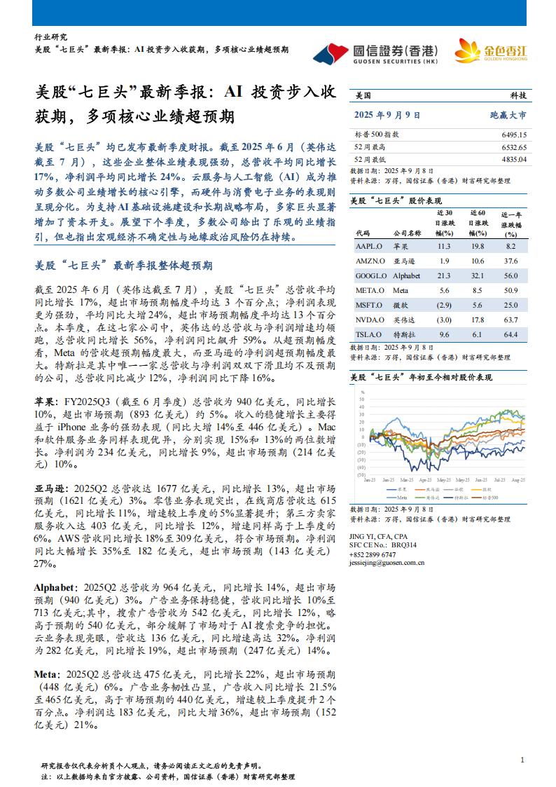 美股“七巨头”均已发布最新季度财报。截至2025年6月(英伟达截至7月),这些企业整体业绩表现强劲,总营收平均同比增长17%,净利润平均同比增长24%。云服务与人工智能(AI)成为推动多数公司业绩增长的核心引擎,而硬件与消费电子业务的表现则呈现分化。为支持AI基础设施建设和长期战略布局,多家巨头显著增加了资本开支。展望下个季度,多数公司给出了乐观的业绩指引,但也指出宏观经济不确定性与地缘政治风险仍在持续。