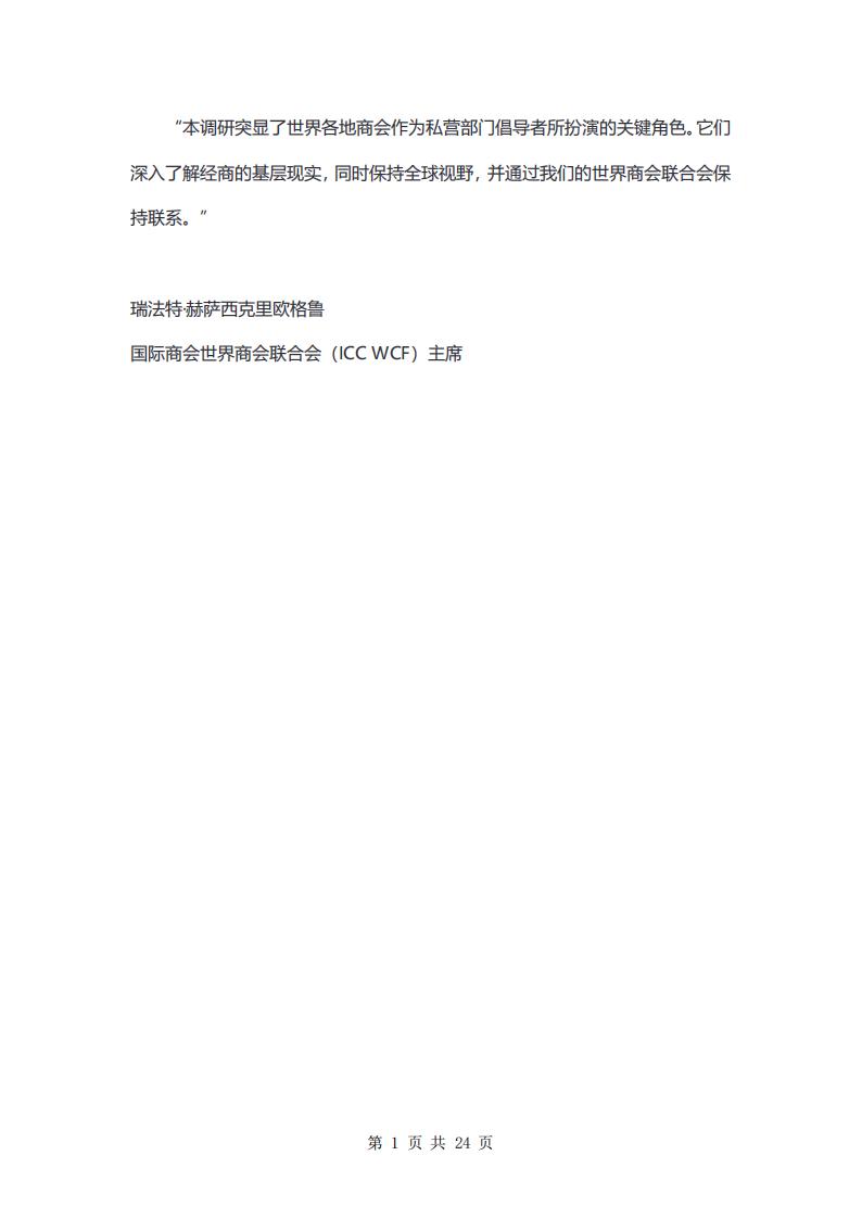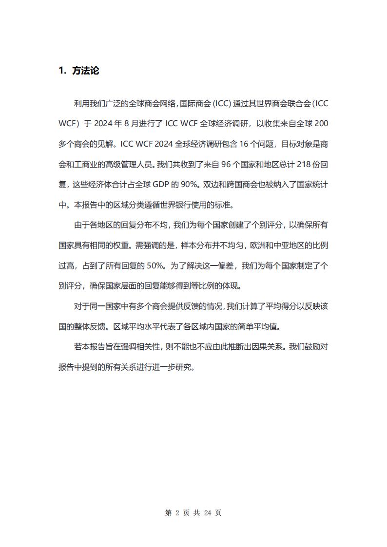 利用我们广泛的全球商会网络,国际商会(ICC)通过其世界商会联合会(ICCWCF)于2024年8月进行了ICC WCF全球经济调研,以收集来自全球200多个商会的见解。ICC WCF 2024全球经济调研包含16个问题,目标对象是商会和工商业的高级管理人员。我们共收到了来自96个国家和地区总计218份回复,这些经济体合计占全球GDP的90%。双边和跨国商会也被纳入了国家统计中。本报告中的区域分类遵循世界银行使用的标准。