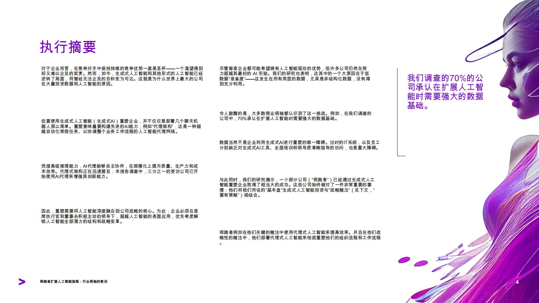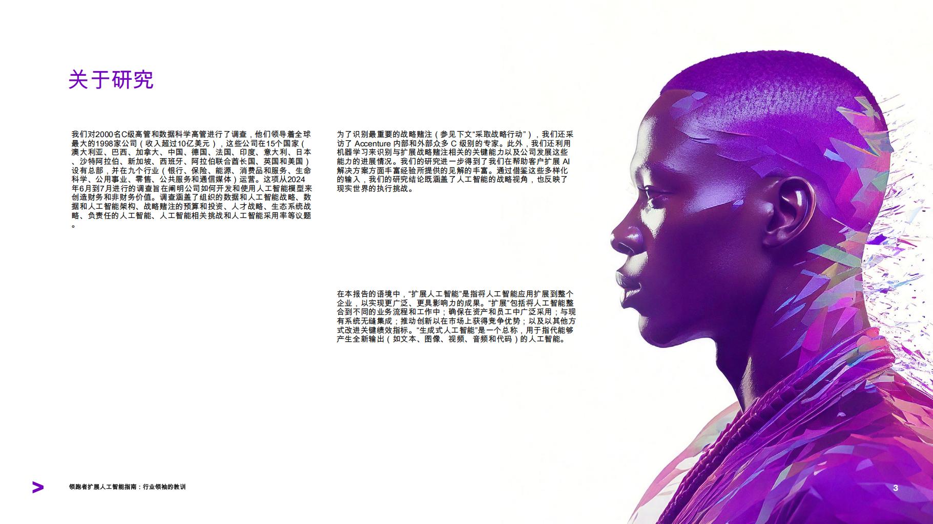 科学,公用事业,需售,公共服务和通信媒体)运营。这项从2024年6月到7月进行的调查智在阐明公司如何开发和使用人工智能模型来创造财务和来财务价值。调查雷蒸了姐织的数据和人工智能歧略。数据和人工智能架构,故略赌注的预算和投资、人才故略,生态系统战略,负责任的人工智能,人工智能相关拱故和人工智能采用率等议题为了识别最重要的歧略赔注(参见下女采取放略行动”),我们还采防了Acoenbure内部和外部众多C级别的专家,此外,我们还利用机图学习来识别与扩履故略蜗注相关的关键能力以及公司发顺这些能力的进膜情况。我们的研究进一步得到了我们在帮助客户扩展AJ解决方案方面丰富经验所提供的见解的丰高,通过借鉴这些多样化的抽入,我们的研究结论既出盖了人工智能的故略视角,也反映了现实世界的执行拱战。