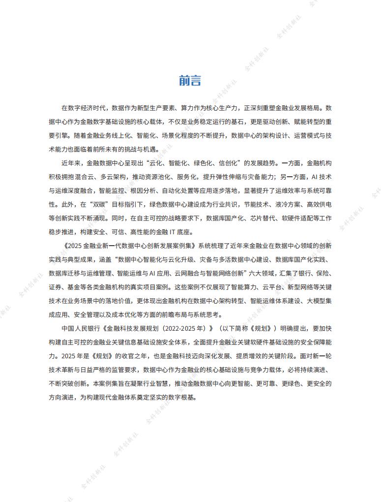 中国人民银行《金融科技发展规划(2022-2025年)》(以下简称《规划》)明确提出,要加快构建自主可控的金融业关键信息基础设施安全体系,全面提升金融业关键软硬件基础设施的安全保障能力。2025年是《规划》的收官之年,也是金融科技迈向深化发展、提质增效的关键阶段。面对新一轮技术革新与日益严格的监管要求,数据中心作为金融业的核心基础设施与竞争力载体,必将持续演进、不断突破创新。本案例集旨在凝聚行业智慧,推动金融数据中心向更智能、更可靠、更绿色、更安全的方向演进,为构建现代金融体系奠定坚实的数字根基。