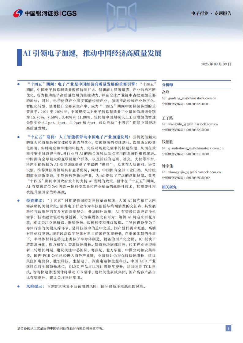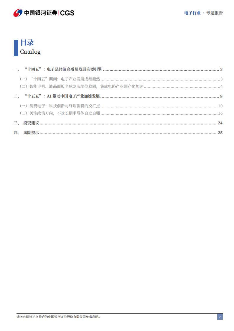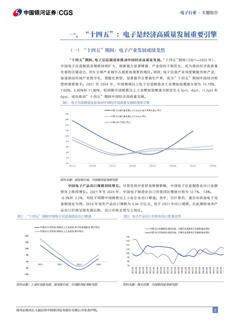 “十四五”期间:电子产业是中国经济高质量发展的重要引擎:“十四五”期间,中国电子信息制造业规模持续扩大、创新能力显著增强、产业结构不断优化,成为推动经济高质量发展的关键动力,并在全球产业链中占据更加重要的地位。同时,电子信息产业深度赋能传统产业,加速推动传统产业数字化、智能化转型,显著提升全要素生产率,成为“十四五”期间中国经济转型的重要推手。2021至2024年,中国规模以上电子信息制造业工业增加值增速分别为15.70%、7.60%、3.40%和11.80%,较同期中国规模以上工业增加值增速分别变化6.1pct、4pct、-1.2pct和6pct,成功推动“十四五”期间中国经济高质量发展。