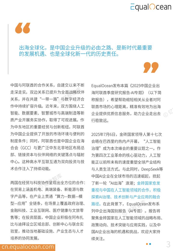 培养的协同发展。EqualOcean发布本篇《2025中国企业出海阿联酋季度研究报告-Al专题》(以下简称报告),希望帮助缩短相关从业者对阿联酋市场的心理距离,精准有效地为出海企业提供优质信息服务,助力企业走出去行稳致远。