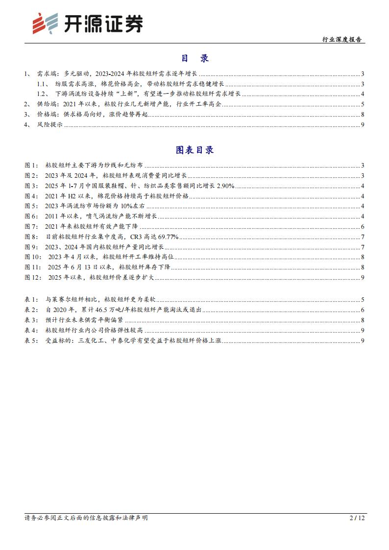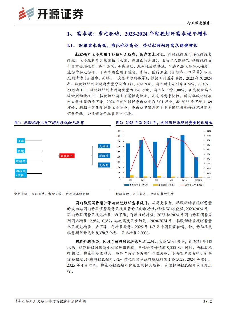 粘胶短纤主要应用于纱线和无纺布,国内需求增长。粘胶短纤属于再生纤维素纤维,主要原料是天然浆粕(木浆、棉浆或竹片浆),俗称“人造棉”。粘胶短纤由于具有吸湿性好、易于染色、手感柔软、悬垂性好等特点,下游产品主要为人棉纱、混纺纱和无纺布,下游终端应用于服装、家纺、医疗卫生(如纱布、口罩等)以及民用清洁(如湿巾、面膜、一次性清洁用品等)。根据百川盈孚数据,2023年及2024年,粘胶短纤的表观消费量分别为381、409万吨,同比增速分别为9.74%、7.28%。2025年H1,粘胶短纤的表观消费量为196万吨,同比仅下滑1.00%,在关税争端比较激烈的情况下,粘胶短纤同比下滑幅度较小,足见其需求韧性。国内粘胶短纤净出口量连续两年下降,2024年粘胶短纤净出口量为3.01万吨,较2022年下滑11.89万吨。根据中国化学纤维工业协会,净出口下滑原因主要是国际采购价格不及国内销售价格,企业倾向于拓展国内市场。国内纺服消费增长带动粘胶短纤需求提升。从历史来看,粘胶短纤表观消费量的波动与国内纺服消费趋势呈现显著的正向联动性。根据Wind数据,2020-2024年,国内纺服消费呈现先增长,后下降,再增长的趋势,2023和2024年国内纺服消费分别同比增长12.9%、0.3%。与之高度同步的是,2020-2024年,粘胶短纤表观消费量也呈现先增长,后下降,再增长趋势。2025年1-7月中国服装鞋帽、针、纺织品类零售额累计达到8,370.7亿元,同比增长2.90%。