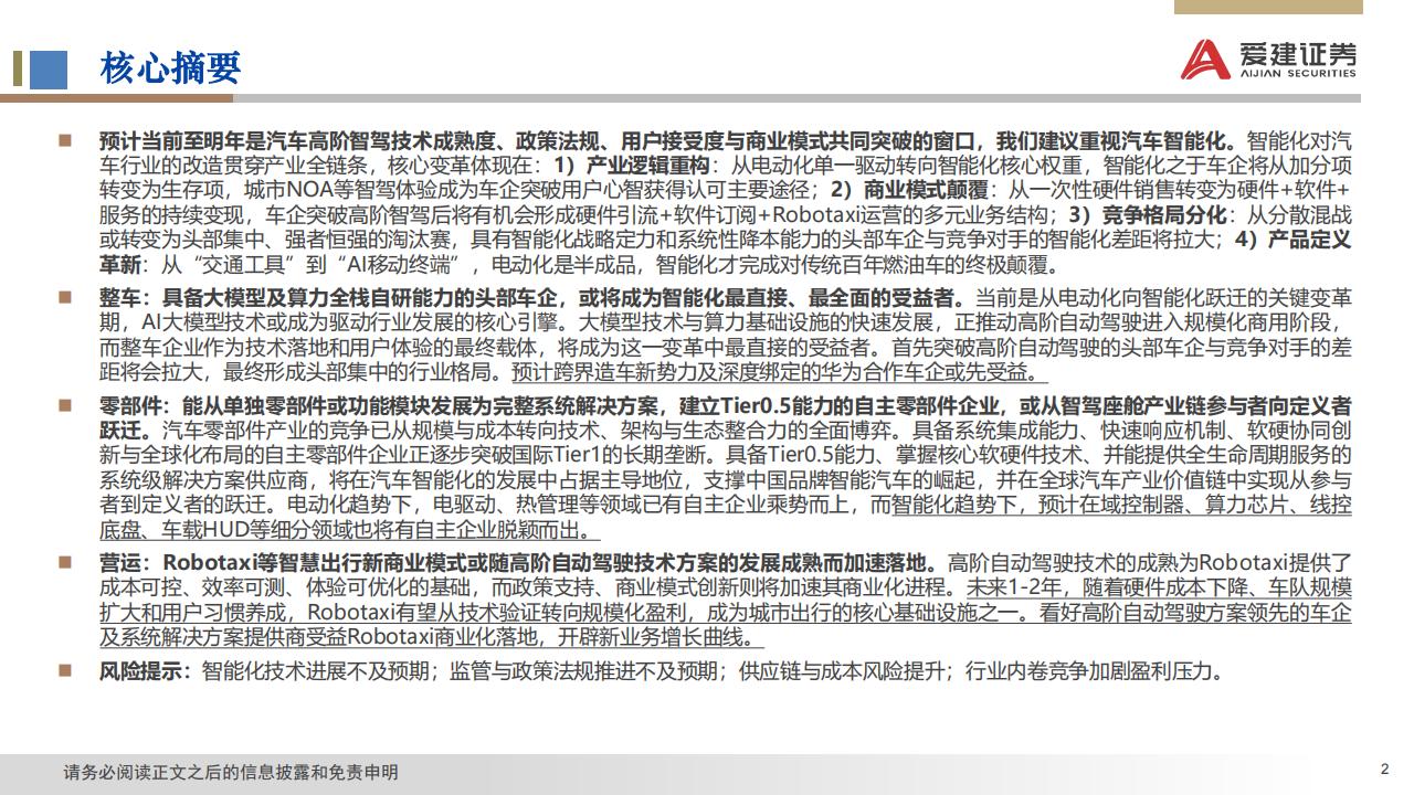 风险提示:智能化技术进展不及预期;监管与政策法规推进不及预期;供应链与成本风险提升;行业内卷竞争加剧盈利压力。