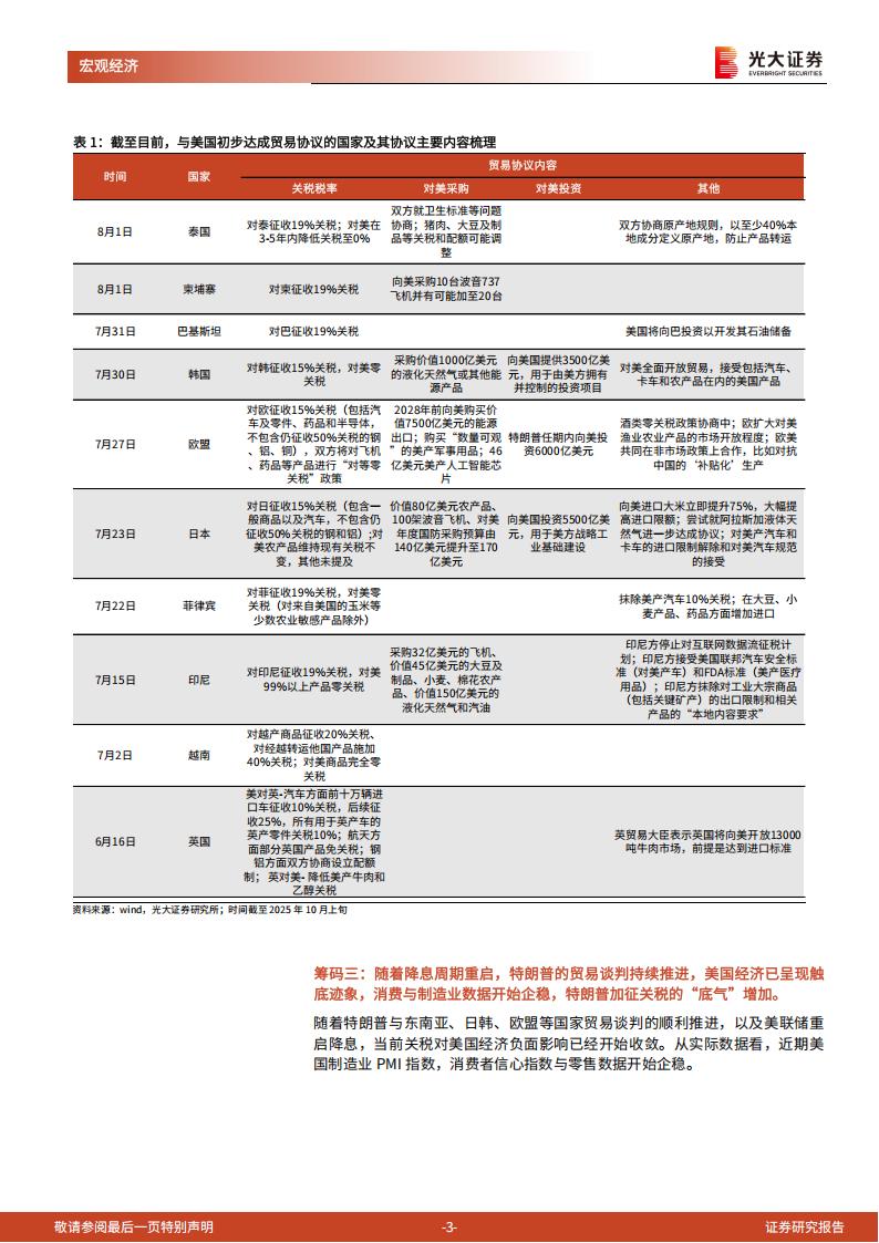 筹码三:随着降息周期重启,特朗普的贸易谈判持续推进,美国经济已呈现触底迹象,消费与制造业数据开始企稳,特朗普加征关税的“底气”增加。