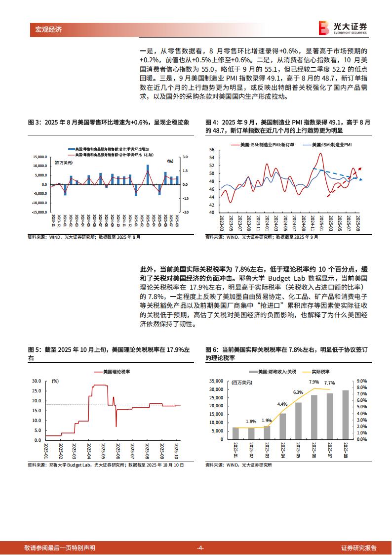 随着特朗普与东南亚、日韩、欧盟等国家贸易谈判的顺利推进,以及美联储重启降息,当前关税对美国经济负面影响已经开始收敛。从实际数据看,近期美国制造业PMI指数,消费者信心指数与零售数据开始企稳。一是,从零售数据看,8月零售环比增速录得+0.6%,显著高于市场预期的+0.2%,前值也从+0.5%上修至+0.6%。二是,从消费者信心指数看,10月美国消费者信心指数为55.0,略低于9月的55.1,但已经较二季度52.2的低点回暖。三是,9月美国制造业PMI指数录得49.1,高于8月的48.7,新订单指数在近几个月的上行趋势更为明显,或反映出特朗普关税强化了国内产品需求,以及国外的采购条款对美国国内生产形成拉动。