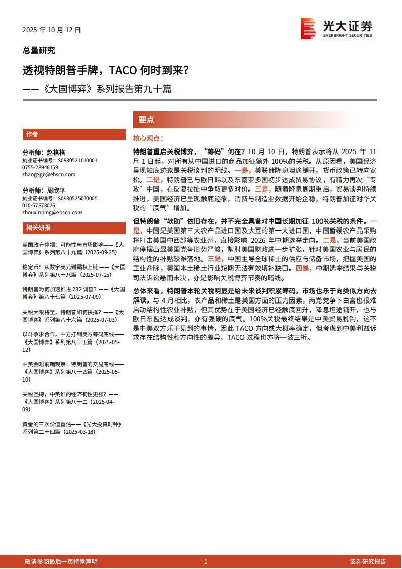 总体来看,特朗普本轮关税明显是给未来谈判积累筹码,市场也乐于向类似方向去解读。与4月相比,农产品和稀土是美国方面的压力因素,两党党争下白宫也很难启动结构性农业补贴,但其优势在于美国经济已经触底回升,降息坦途铺开,也与欧日东盟达成谈判,亦有强硬的底气。100%关税最终结果是中美贸易脱钩,这不是中美双方乐于见到的事情,因此TACO方向或大概率确定,但考虑到中美利益诉求存在结构性和方向性的差异,TACO过程也亦将一波三折。