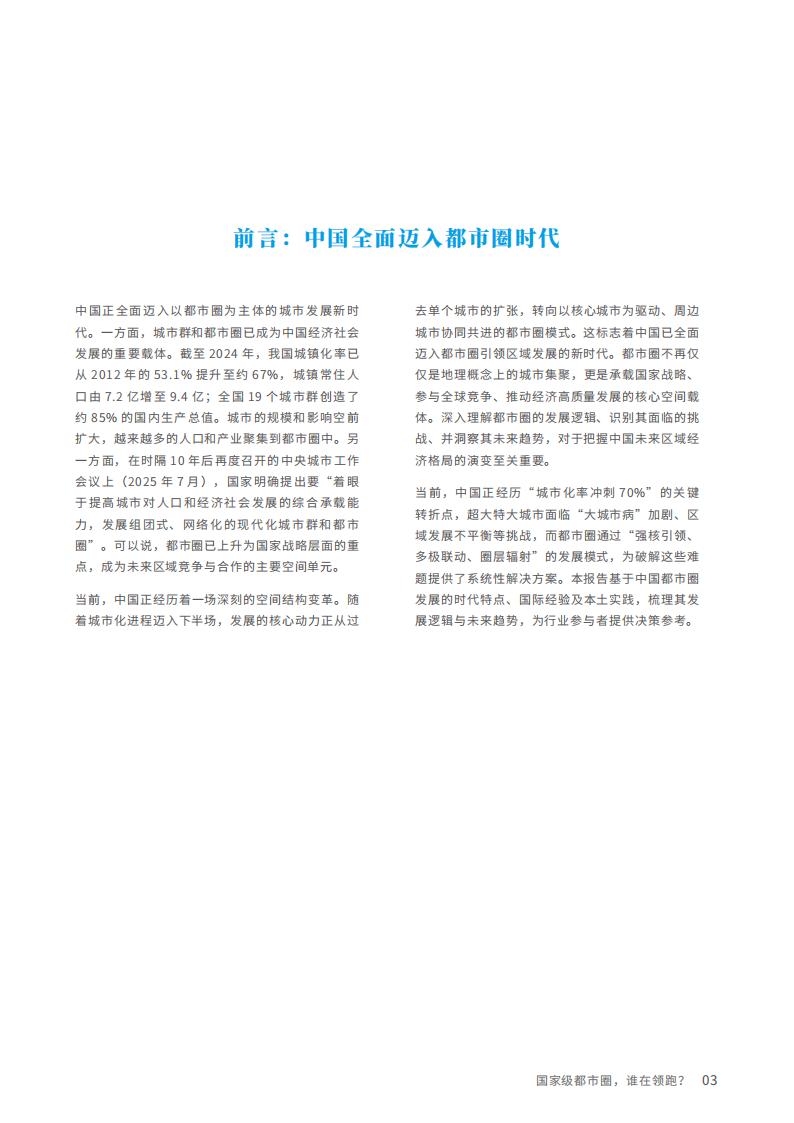 中国正全面迈入以都市圈为主体的城市发展新时代。一方面,城市群和都市圈已成为中国经济社会发展的重要载体。截至2024年,我国城镇化率已从2012年的53.1%提升至约67%,城镇常住人口由7.2亿增至9.4亿;全国19个城市群创造了约85%的国内生产总值。城市的规模和影响空前扩大,越来越多的人口和产业聚集到都市圈中。另一方面,在时隔10年后再度召开的中央城市工作会议上(2025年7月),国家明确提出要“着眼于提高城市对人口和经济社会发展的综合承载能力,发展组团式、网络化的现代化城市群和都市圈”。可以说,都市圈已上升为国家战略层面的重点,成为未来区域竞争与合作的主要空间单元。