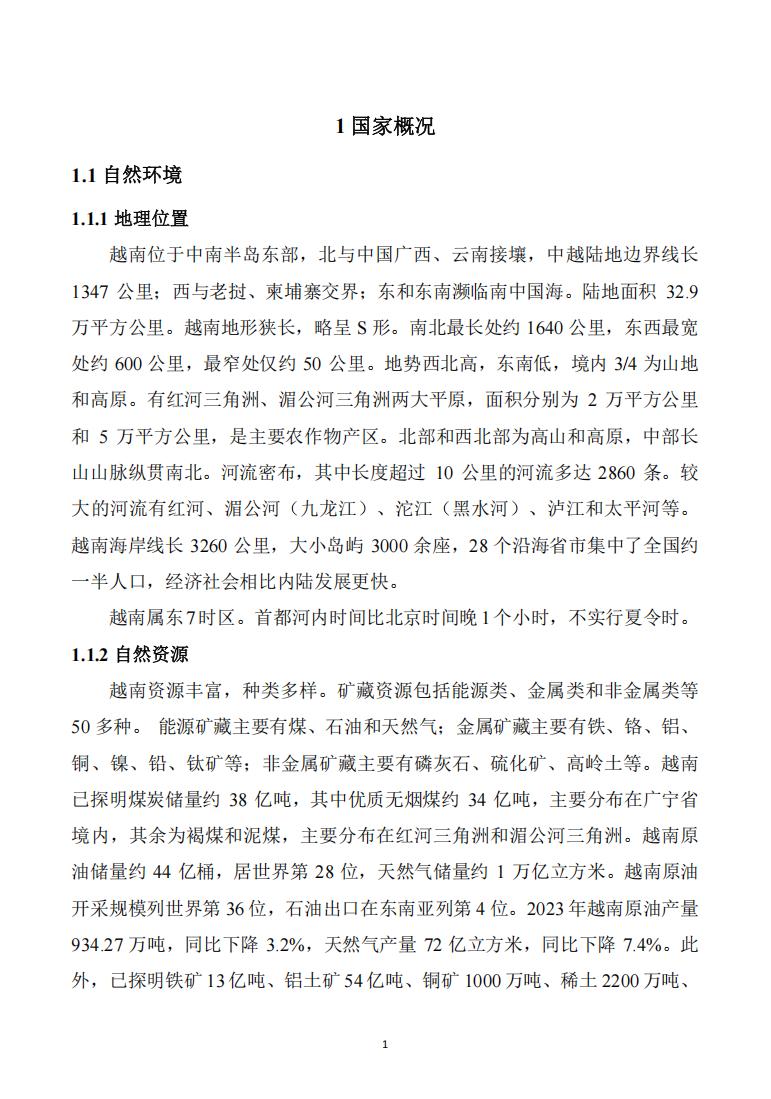 越南资源丰富,种类多样。矿藏资源包括能源类、金属类和非金属类等50多种。能源矿藏主要有煤、石油和天然气;金属矿藏主要有铁、铬、铝、铜、镍、铅、钛矿等;非金属矿藏主要有磷灰石、硫化矿、高岭土等。越南已探明煤炭储量约38亿吨,其中优质无烟煤约34亿吨,主要分布在广宁省境内,其余为褐煤和泥煤,主要分布在红河三角洲和湄公河三角洲。越南原油储量约44亿桶,居世界第28位,天然气储量约1万亿立方米。越南原油开采规模列世界第36位,石油出口在东南亚列第4位。2023年越南原油产量934.27万吨,同比下降3.2%,天然气产量72亿立方米,同比下降7.4%。此外,已探明铁矿13亿吨、铝土矿54亿吨、铜矿1000万吨、稀土2200万吨、铬矿2000万吨、钛矿2000万吨、锆矿450万吨、镍矿152万吨、高岭土2000万吨。