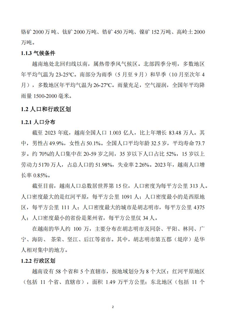 截至2023年底,越南全国人口1.003亿人,比上年增长83.48万人。其中,男性占49.9%,女性占50.1%。全国人口平均年龄32.5岁,平均寿命73.7岁。约70%的人口集中在20-59岁之间,35岁以下人口占比52%,15岁以上劳动力5170万人,占总人口的51.98%,失业率2.26%。2023年,越南人口增长率0.85%。