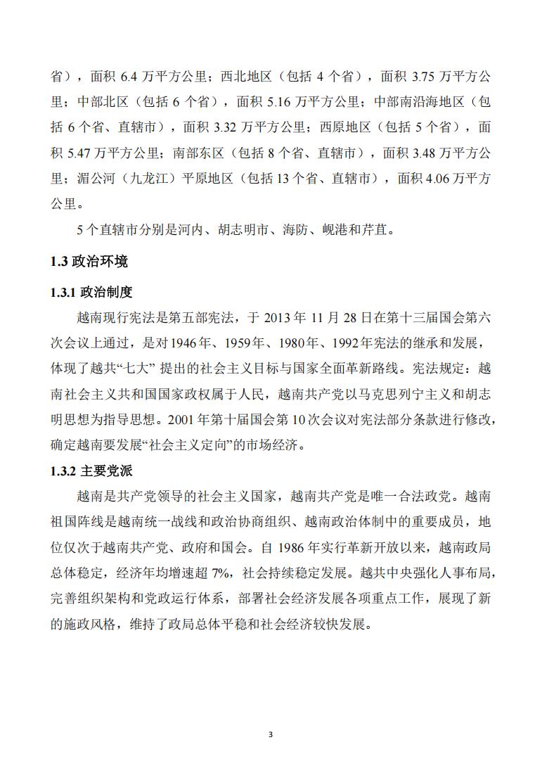 越南是共产党领导的社会主义国家,越南共产党是唯一合法政党。越南祖国阵线是越南统一战线和政治协商组织、越南政治体制中的重要成员,地位仅次于越南共产党、政府和国会。自1986年实行革新开放以来,越南政局总体稳定,经济年均增速超7%,社会持续稳定发展。越共中央强化人事布局,完善组织架构和党政运行体系,部署社会经济发展各项重点工作,展现了新的施政风格,维持了政局总体平稳和社会经济较快发展。