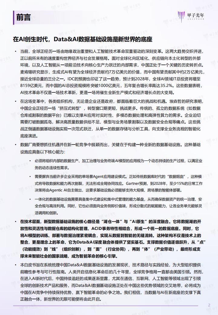 本白皮书旨在系统梳理中国Data&AI数据基础设施的发展现状、技术路径与实践经验,为大型组织提供前瞻性参考与可行性指南。人类开启信息化革命后的几十年里,全球竞争格局一直都由美国引领。然而,在进入AI新时代后,中国持续追赶的成果逐渐显露,尤其在通信、互联网、人工智能等领域出现了引领全球的创新技术产品和服务,而Data&AI数据基础设施正处在中国这些优势领域的交叉地带,必将成为中国在AI竞争中持续保持优势、赢下智能革命的必争之地。我们相信,当数据与AI在新底座的支撑下真正融合一体,新世界的无限可能便将由此开启数据应用与人工智能从相互独立到逐渐融合