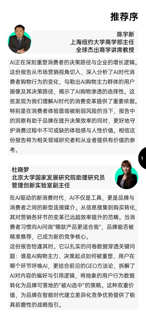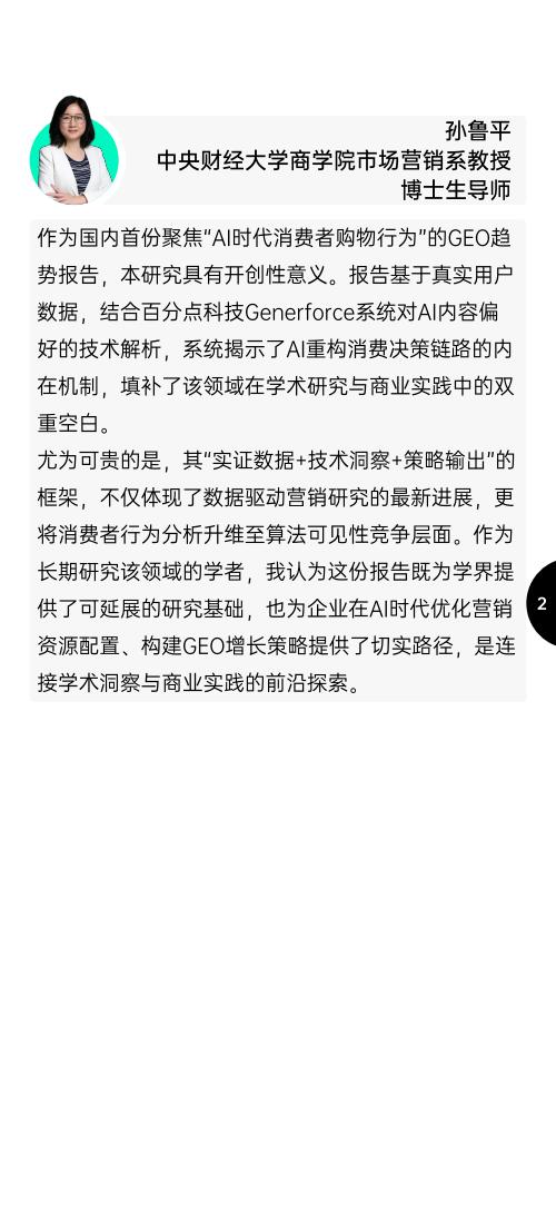 尤为可贵的是,其“实证数据+技术洞察+策略输出”的框架,不仅体现了数据驱动营销研究的最新进展,更将消费者行为分析升维至算法可见性竞争层面。作为长期研究该领域的学者,我认为这份报告既为学界提供了可延展的研究基础,也为企业在AI时代优化营销资源配置、构建GEO增长策略提供了切实路径,是连接学术洞察与商业实践的前沿探索。