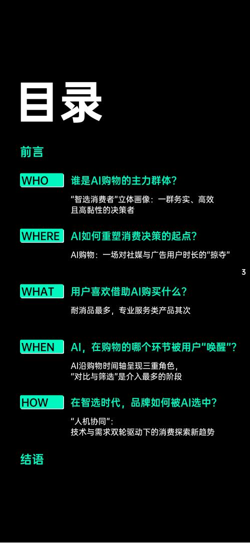 Al正在深刻重塑消费者的决策路径与企业的增长逻辑。这份报告从市场营销视角切入,深入分析了AI时代消费者购物行为的变化,勾勒出AI购物主力群体的用户画像及其决策路径,揭示了AI购物渗透的选择性。这些发现为我们理解Al时代的消费变革提供了重要依据。特别是在消费者体验面临被削弱风险的当下,报告中的洞察有助于品牌在提升决策效率的同时,更好地守护消费过程中不可或缺的体验感与人性价值。相信这份报告将为相关领域研究者和从业者提供有价值的参考。