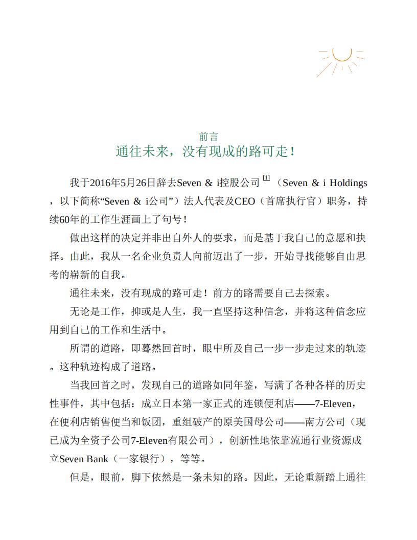 我于2016年5月26日辞去Seven &i控股公司(Seven &iHoldings,以下简称“Seven &i公司”)法人代表及CEO(首席执行官)职务,持续60年的工作生涯画上了句号!