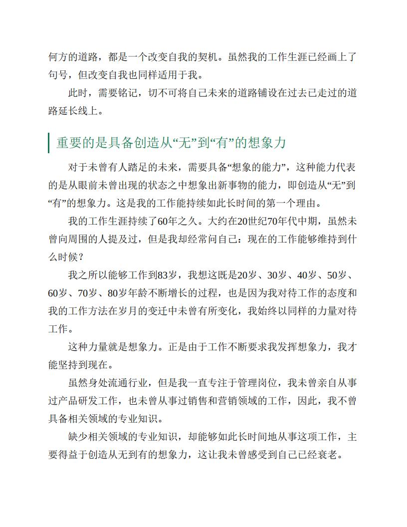 对于未曾有人踏足的未来,需要具备“想象的能力”,这种能力代表的是从眼前未曾出现的状态之中想象出新事物的能力,即创造从“无”到“有”的想象力。这是我的工作能持续如此长时间的第一个理由。