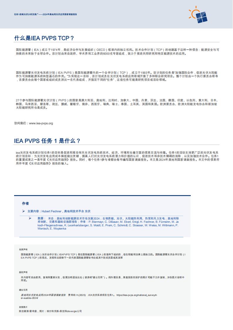 iea光伏发电系统计划任务1的目标是促进和推动有关光伏发电系统技术、经济、环境和社會方面的信息交流与传播。任务1的活动支持更广泛的光伏发电系统计划目标:为光伏发电应用成本降低做出贡献,提高人们对光伏发电系统潜力和价值的认识,促进技术和非技术障碍的消除,以及加强技术合作。任务1的重要成果之一是年度《光伏应用趋势》报告。同时,每个任务1参与者都会每年编写国家调查报告。本文是2024年奥地利国家调查报告。本文中的信息将用作年度《光伏应用趋势》报告的输入。