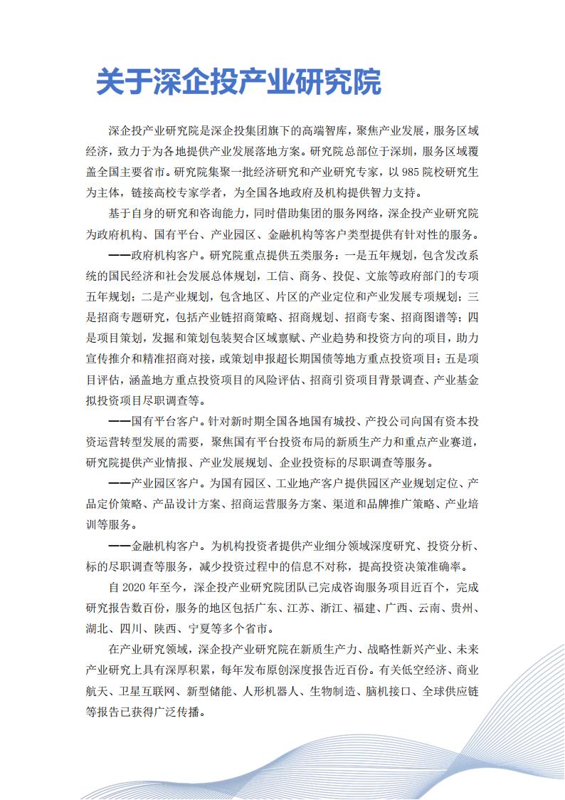 深企投产业研究院是深企投集团旗下的高端智库,聚焦产业发展,服务区域经济,致力于为各地提供产业发展落地方案。研究院总部位于深圳,服务区域覆盖全国主要省市。研究院集聚一批经济研究和产业研究专家,以985院校研究生为主体,链接高校专家学者,为全国各地政府及机构提供智力支持。