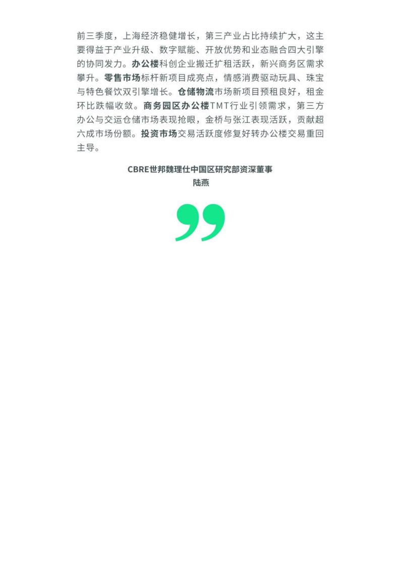 前三季度,上海经济稳健增长,第三产业占比持续扩大,这主要得益于产业升级、数字赋能、开放优势和业态融合四大引擎的协同发力。办公楼科创企业搬迁扩租活跃,新兴商务区需求攀升。零售市场标杆新项目成亮点,情感消费驱动玩具、珠宝与特色餐饮双引擎增长。仓储物流市场新项目预租良好,租金环比跌幅收敛。商务园区办公楼TMT行业引领需求,第三方办公与交运仓储市场表现抢眼,金桥与张江表现活跃,贡献超六成市场份额。投资市场交易活跃度修复好转办公楼交易重回主导。