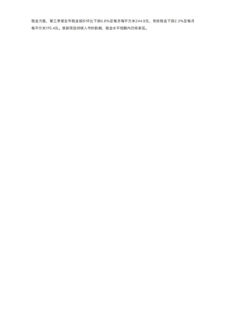 从区位表现来看,本季度五角场跃居首位,主要来自字节跳动集团的扩租以及部分消费品零售企业的搬迁需求;淮海中路位列第二,增长动力来源于保险等金融公司的推动,其中太平洋新天地中心在本季度最为活跃;陆家嘴排名第三,以金融和专业服务类企业的搬迁需求为主,尤其是板块内部流动较为活跃;虹桥板块位居第四,制造业和专业服务类企业的活跃度保持高位;南京西路位列第五,奢侈品零售行业及金融行业构成其核心需求来源。租金方面,第三季度全市租金报价环比下跌0.8%至每月每平方米244.9元,有效租金下跌2.3%至每月每平方米170.4元。受新项目持续入市的影响,租金水平短期内仍将承压。