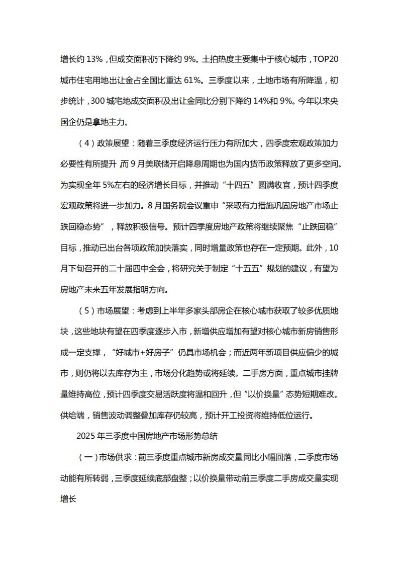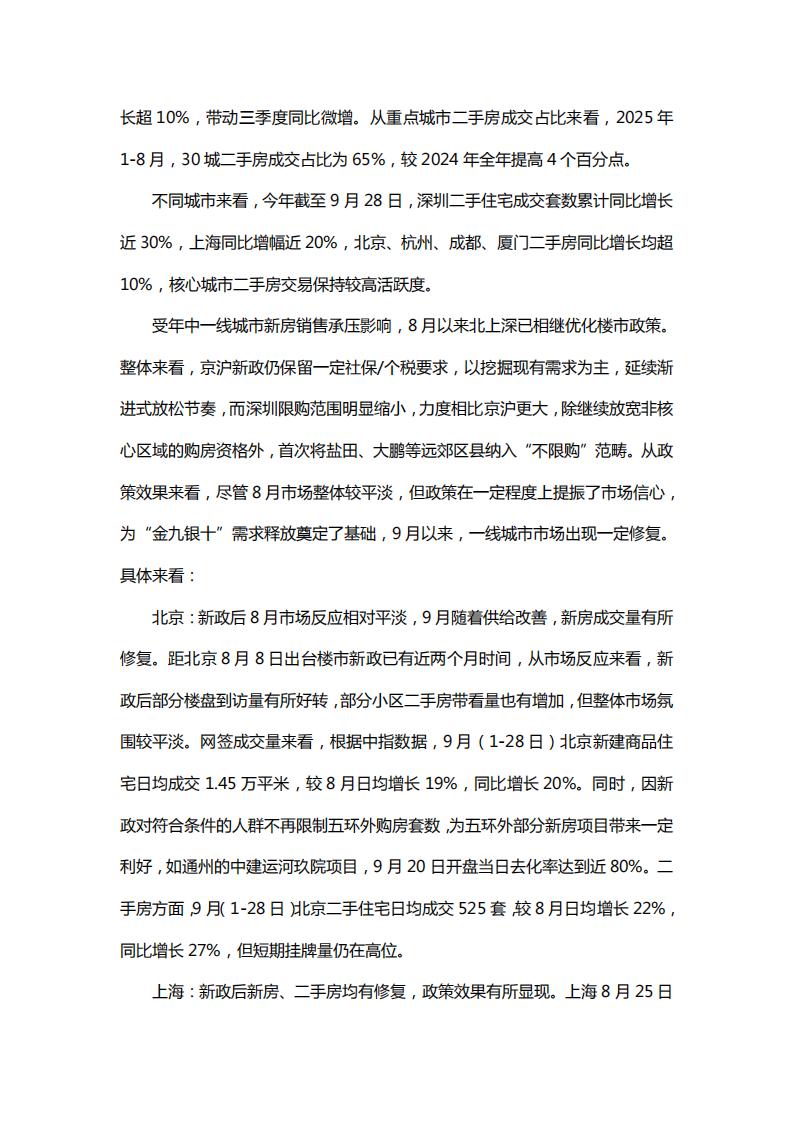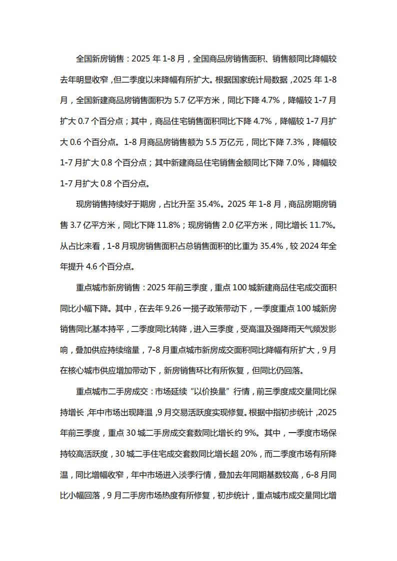 (1)市场供求:2025年以来新房市场整体运行平稳,但二季度以来销售有所转弱,7-8月受预期偏弱及淡季因素影响,市场较为平淡,9月供应改善带动销售略有修复。二手房市场持续“以价换量”,前三季度重点城市二手住宅成交套数累计同比保持增长,其中经过6-8月阶段性降温后,9月二手房成交量同环比均出现回升。