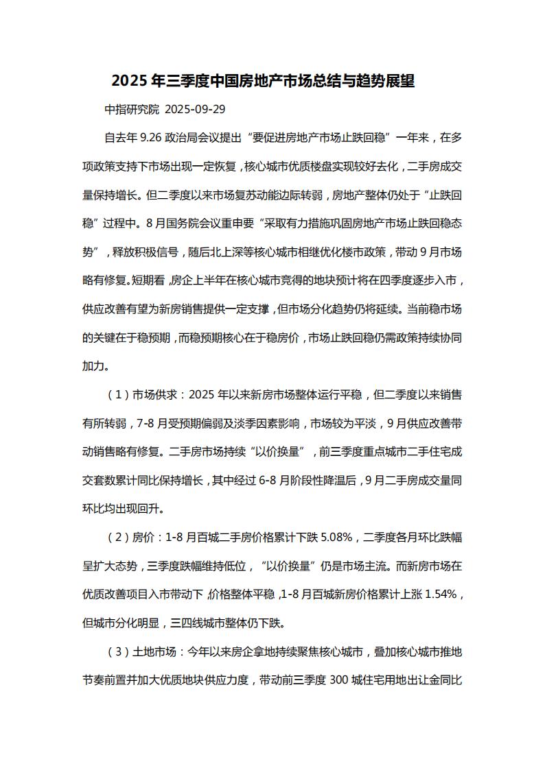 自去年9.26政治局会议提出“要促进房地产市场止跌回稳”一年来,在多项政策支持下市场出现一定恢复,核心城市优质楼盘实现较好去化,二手房成交量保持增长。但二季度以来市场复苏动能边际转弱,房地产整体仍处于“止跌回稳”过程中。8月国务院会议重申要“采取有力措施巩固房地产市场止跌回稳态势”,释放积极信号,随后北上深等核心城市相继优化楼市政策,带动9月市场略有修复。短期看,房企上半年在核心城市竞得的地块预计将在四季度逐步入市,供应改善有望为新房销售提供一定支撑,但市场分化趋势仍将延续。当前稳市场的关键在于稳预期,而稳预期核心在于稳房价,市场止跌回稳仍需政策持续协同加力。