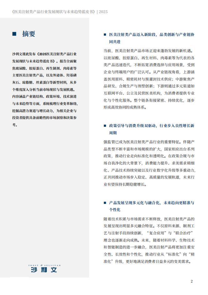 沙利文谨此发布《2025医美注射类产品行业考。发展现状与未来趋势蓝皮书》。报告全面聚焦玻尿酸、胶原蛋白、再生制剂、肉毒素等主要医美注射类产品,以及外泌体、羟基磷灰石、琼脂糖、丝素蛋白等新型材料,从多个维度深入分析当前市场现状与发展机遇。内容涵盖产业链结构、政策环境、技术演进与未来趋势等方面,系统梳理行业变革脉络,挖掘高潜力赛道与增长动力,为相关企业与投资者提供具备前瞻性的市场洞察和决策参