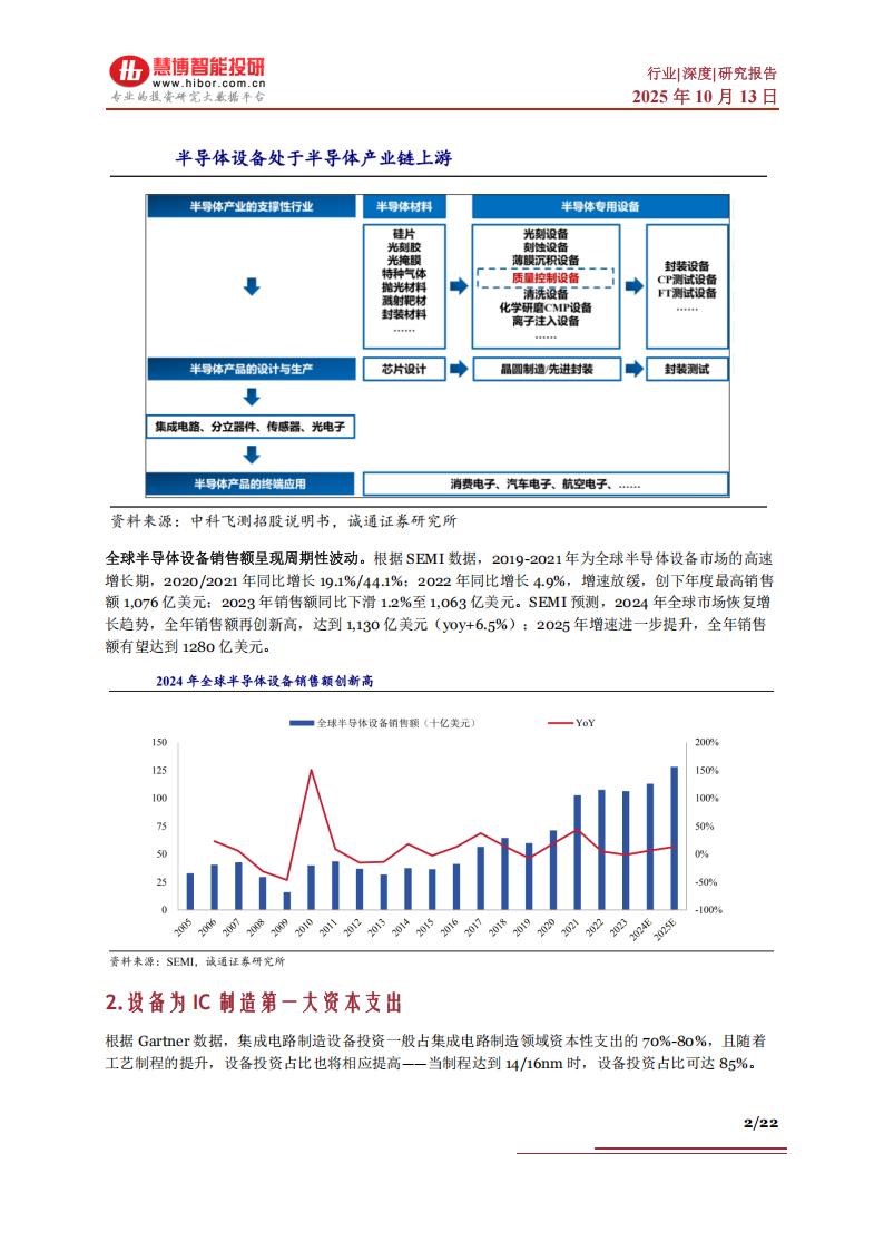 半导体行业的产业链上游为半导体材料、半导体设备等支撑性行业;中游为芯片设计、晶圆制造和封装测试等环节,产业链下游为终端产品及其应用行业。全球半导体设备销售额呈现周期性波动。根据SEMI数据,2019-2021年为全球半导体设备市场的高速增长期,2020/2021年同比增长19.1%/44.1%;2022年同比增长4.9%,增速放缓,创下年度最高销售额1,076亿美元;2023年销售额同比下滑1.2%至1,063亿美元。SEMI预测,2024年全球市场恢复增长趋势,全年销售额再创新高,达到1,130亿美元(yoy+6.5%);2025年增速进一步提升,全年销售额有望达到1280亿美元。