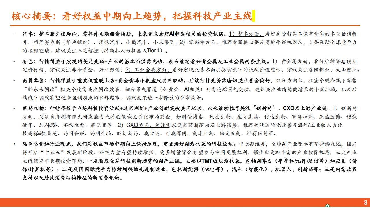 结合总量和行业观点,我们对权益市场中期向上保持乐观,重点看好Al为代表的科技板块。中长期维度,全球Al产业变革有望持续深化,国内将开启“十五五”发展新阶段、科技力量有望持续增强,更多增量资金有望参与中国发展红利,催生出更加丰富的产业投资机遇,三大产业主线值得中长期投资布局:一是顺应全球科技创新趋势的A产业链,主要以TMT板块为代表,包括A算力(半导体/元件/通信等)和应用(传媒/计算机等);二是我国国际竞争力持续增强的先进制造业,包括新能源(锂电等)、汽车(智能化)、机器人、创新药等;三是内需政策支持以及居民消费结构转型的新消费领域。