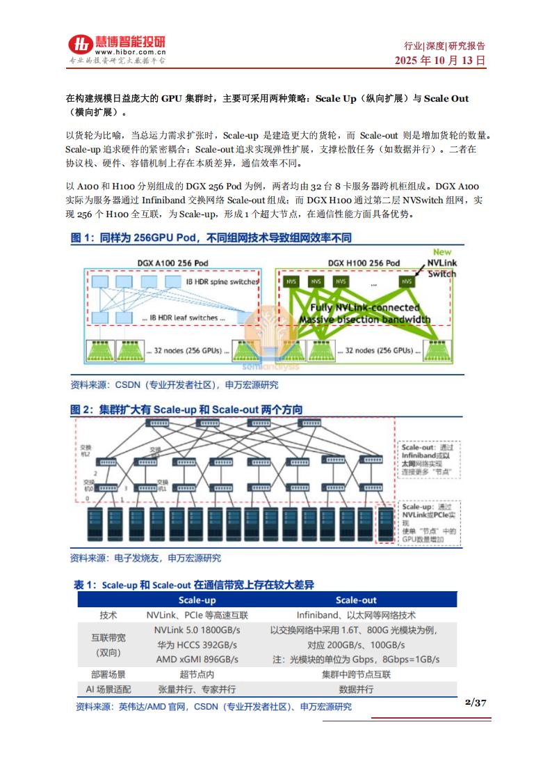 Scale Up较多表示GPU在节点内部的性能扩充。例如:增加Compute die或HBM的数量、性能;增加服务器等节点内的GPU数量,通过PCB、铜线等进行小范围互联;有时会增加一层交换芯片,例如PCle Switch、NVSwitch都是算力Scale Up的一部分。(传统的AI4卡、8卡、16卡服务器都是典型的Scale Up形式。)