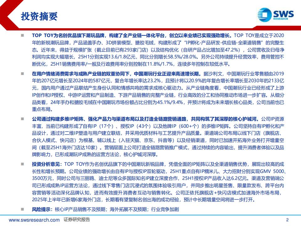 投资分析意见:TOP TOY作为名创优品旗下的中国潮玩新锐品牌,凭借全面的IP矩阵以及全渠道销售优势,展现出较高的成长性和增长预期。公司业绩的强劲增长由自有IP与授权IP双轮驱动,25H1重点自有IP糯米儿、大力招财分别实现GMV 5000、3500万元,同时公司与三丽鸥、迪士尼等众多国际知名IP建立深度合作,25H1授权IP产品收入达6.2亿元。渠道及营销端公司已形成成熟IP运营方法论,通过线下零售门店沉浸式的氛围体验吸引用户,并同步推出明星签售、限量款发布、跨平台内容营销等活动深化品牌认知,进而有效提升消费者互动与销售转化。公司正依托旗舰店+快闪店模式加速海外市场布局,2025年上半年已新增6家海外门店,长期看有望复制名创出海的成功经验,预计中长期增量空间将进一步打开。