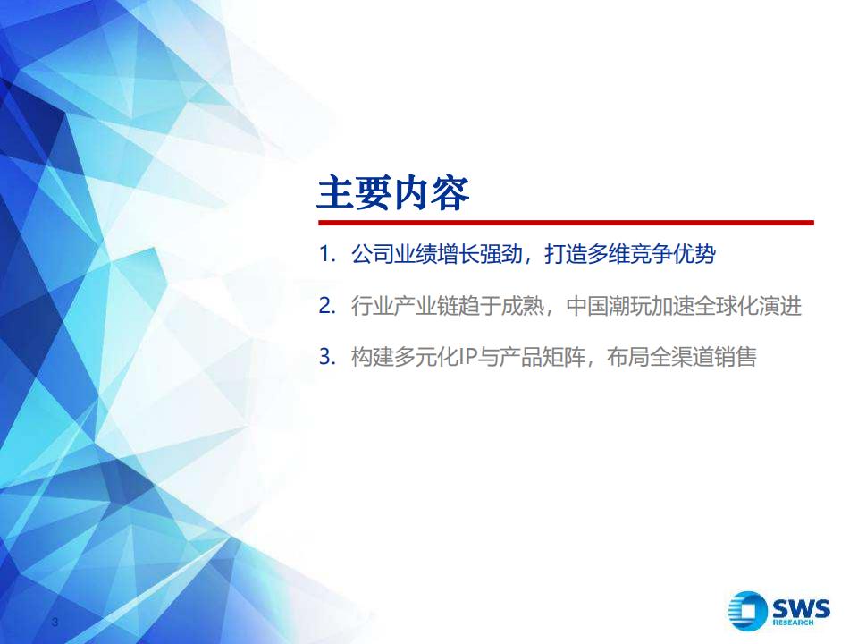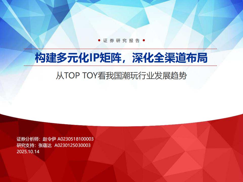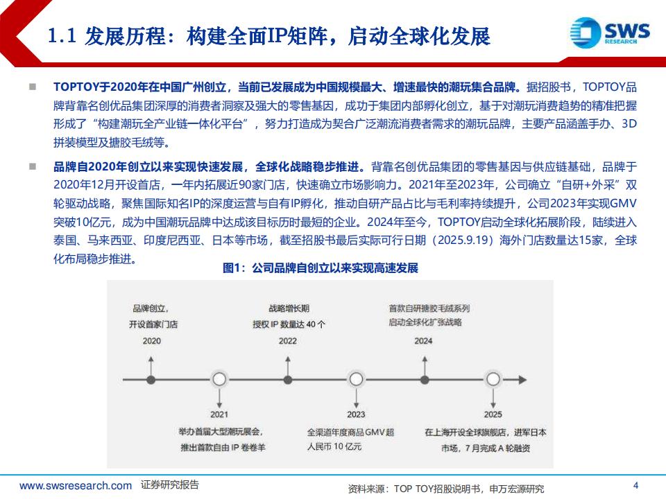风险提示:核心IP产品销售不及预期;海外拓展不及预期;行业竞争加剧TOPTOY于2020年在中国广州创立,当前已发展成为中国规模最大、增速最快的潮玩集合品牌。据招股书,TOPTOY品牌背靠名创优品集团深厚的消费者洞察及强大的零售基因,成功于集团内部孵化创立,基于对潮玩消费趋势的精准把握形成了“构建潮玩全产业链一体化平台”,努力打造成为契合广泛潮流消费者需求的潮玩品牌,主要产品涵盖手办、3D拼装模型及搪胶毛绒等。